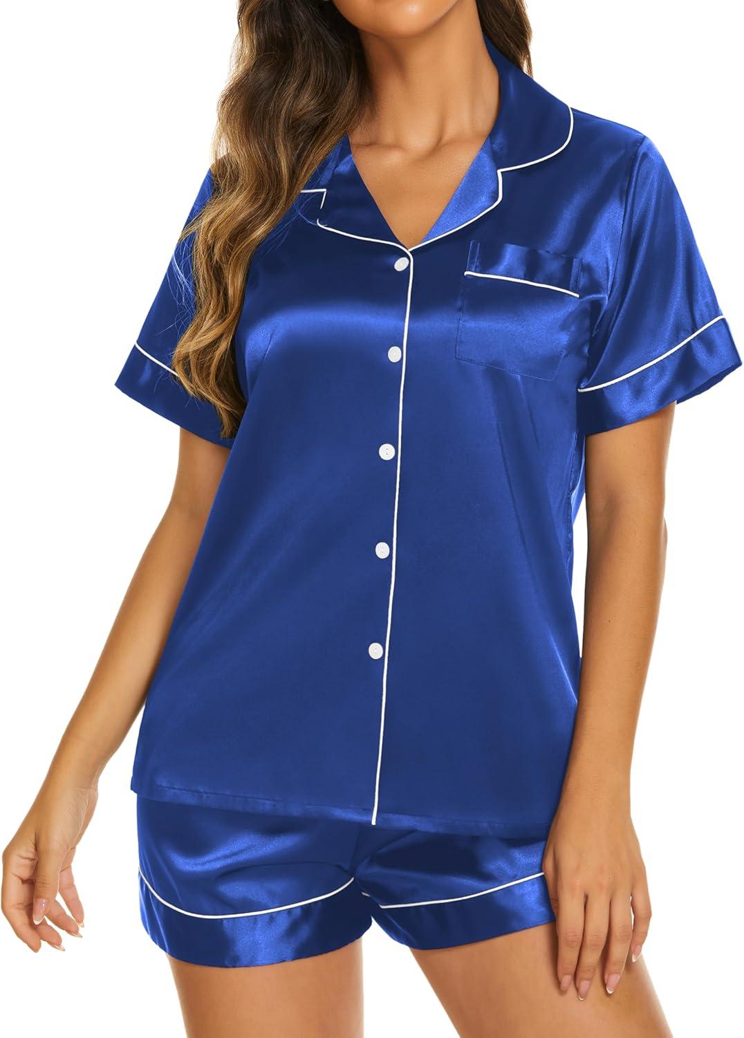 Ekouaer Silk Pajamas for Women Short Sleeve Sleepwear Soft Button Down Loungewear 2 Piece Satin Pjs Shorts Set S-XXL(Royal Blue)