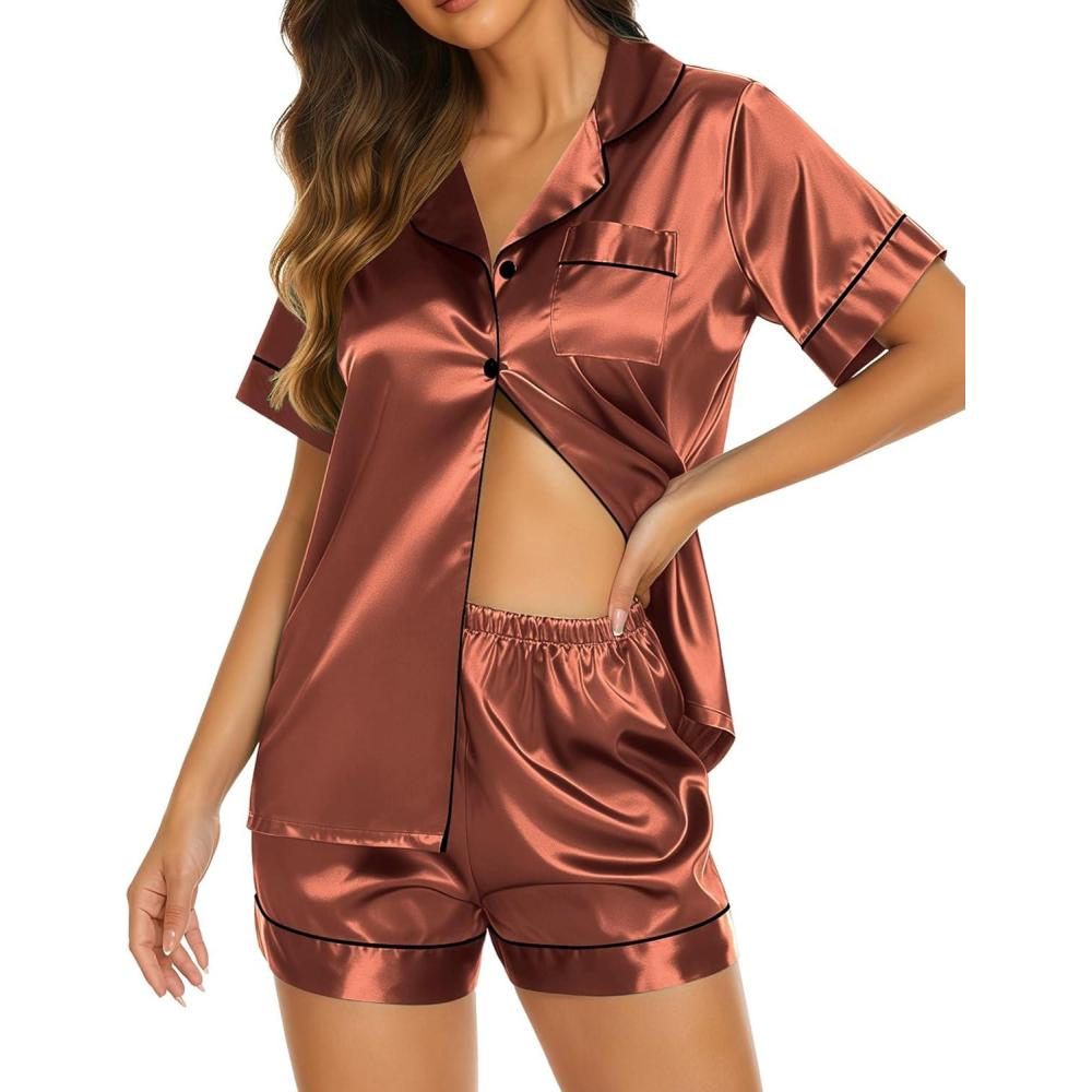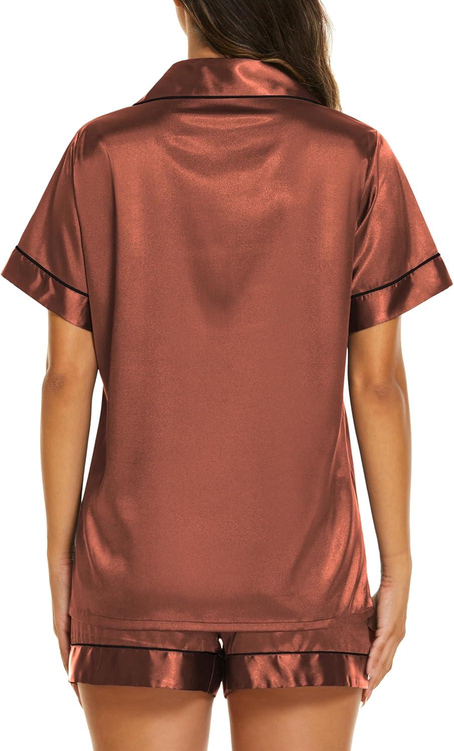 Ekouaer Silk Pajamas for Women Short Sleeve Sleepwear Soft Button Down Loungewear 2 Piece Satin Pjs Shorts Set(Brown)