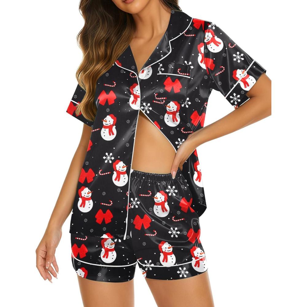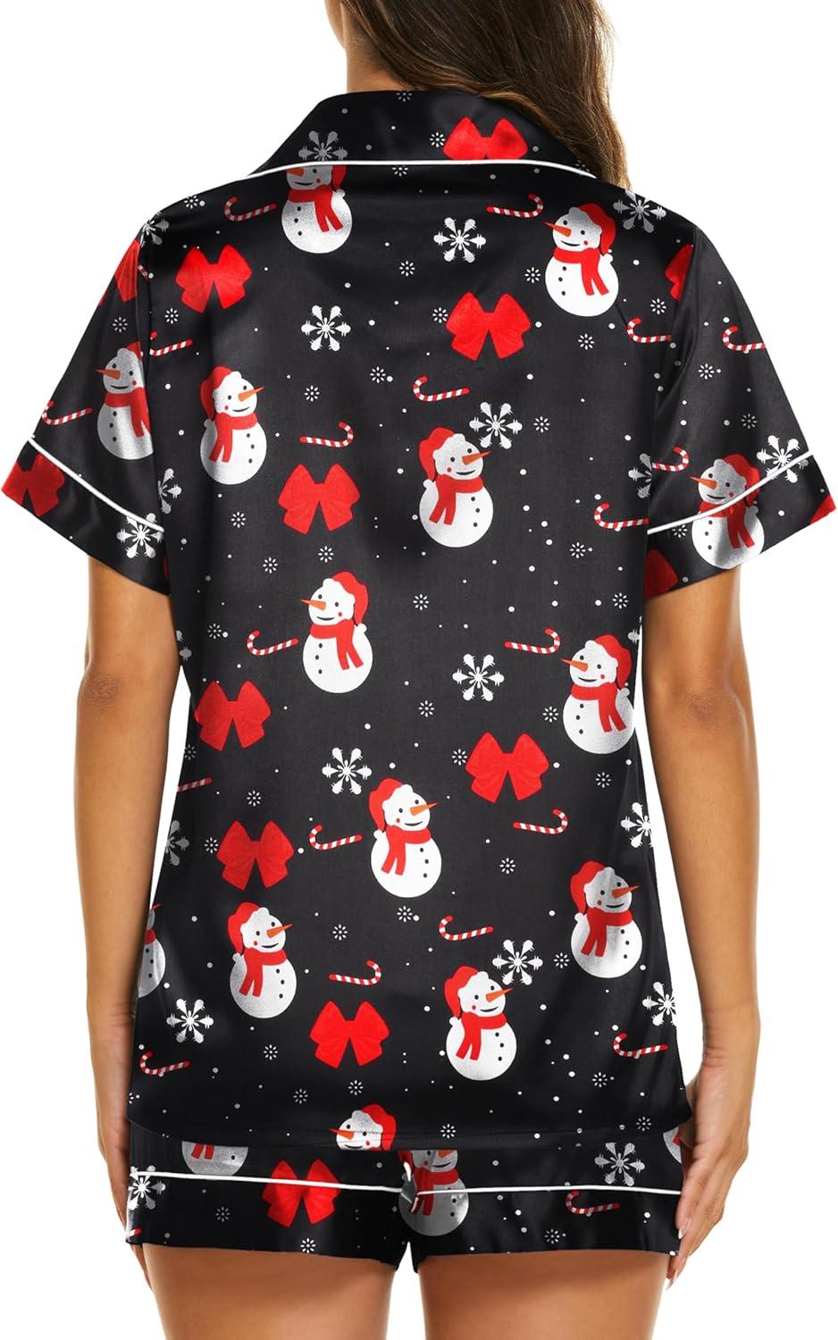 Ekouaer Silk Pajamas for Women Short Sleeve Sleepwear Soft Button Down Loungewear 2 Piece Satin Pjs Shorts Set(Christmas Black)