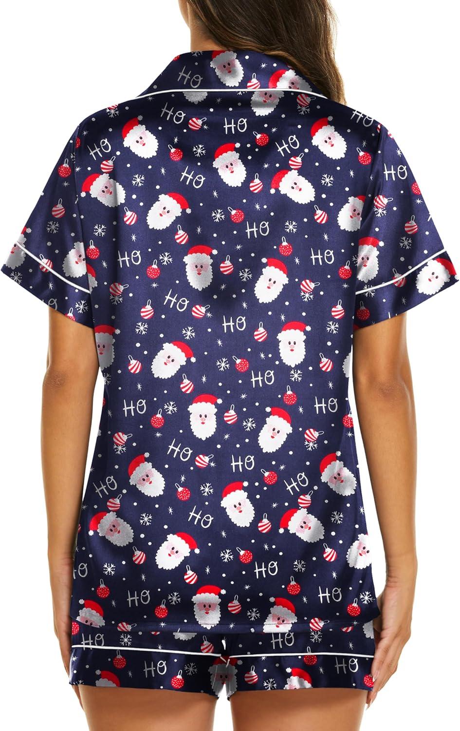 Ekouaer Silk Pajamas for Women Short Sleeve Sleepwear Soft Button Down Loungewear 2 Piece Satin Pjs Shorts Set(Christmas Navy)
