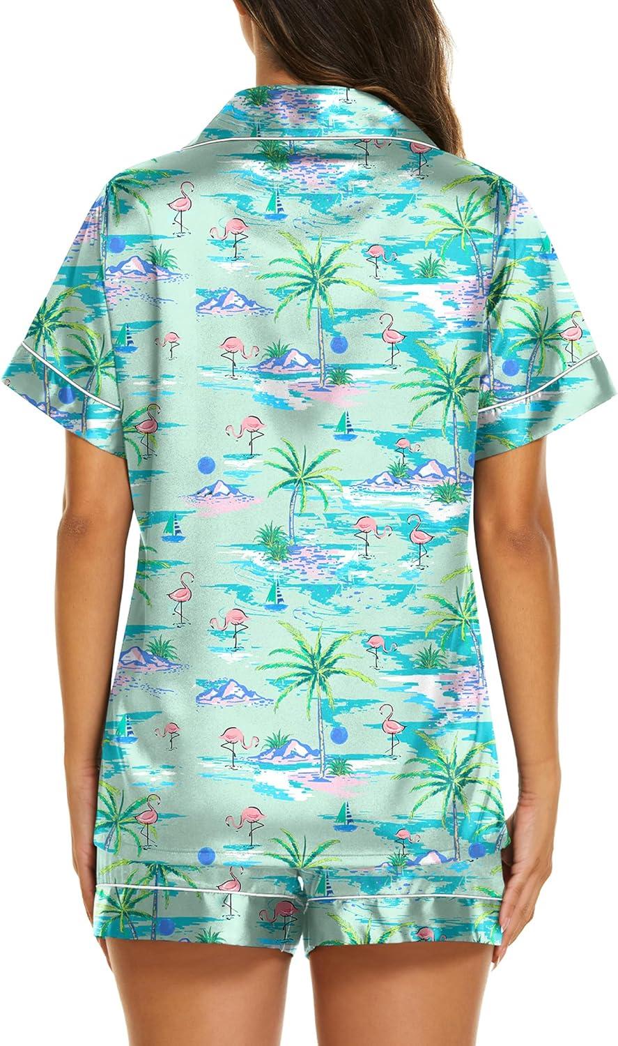 Ekouaer Silk Pajamas for Women Short Sleeve Sleepwear Soft Button Down Loungewear 2 Piece Satin Pjs Shorts Set(Flamingo Light Green)