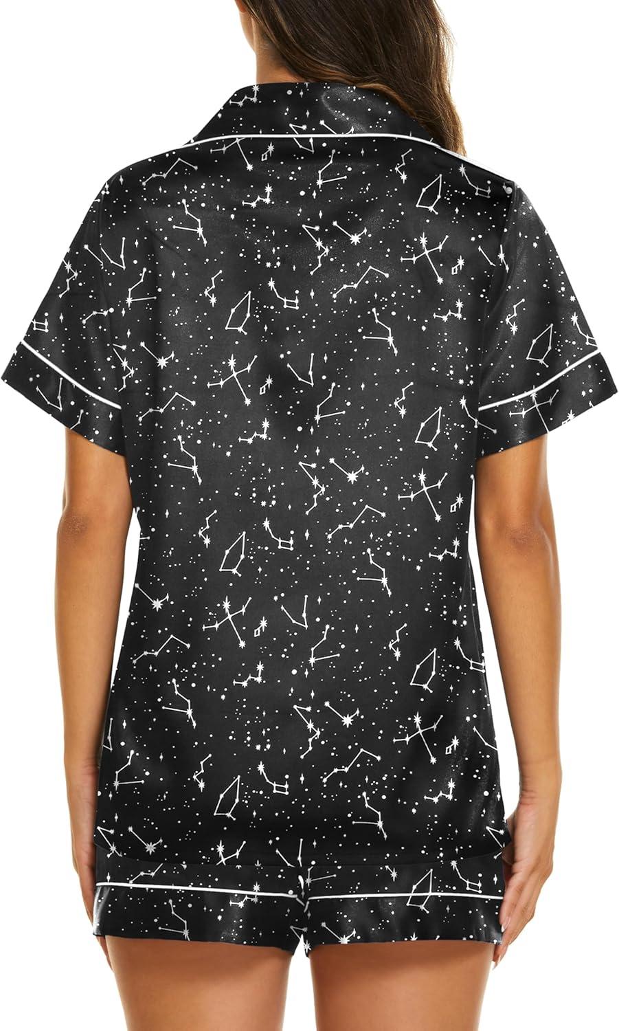 Ekouaer Silk Pajamas for Women Short Sleeve Sleepwear Soft Button Down Loungewear 2 Piece Satin Pjs Shorts Set(Floral Black Stars)