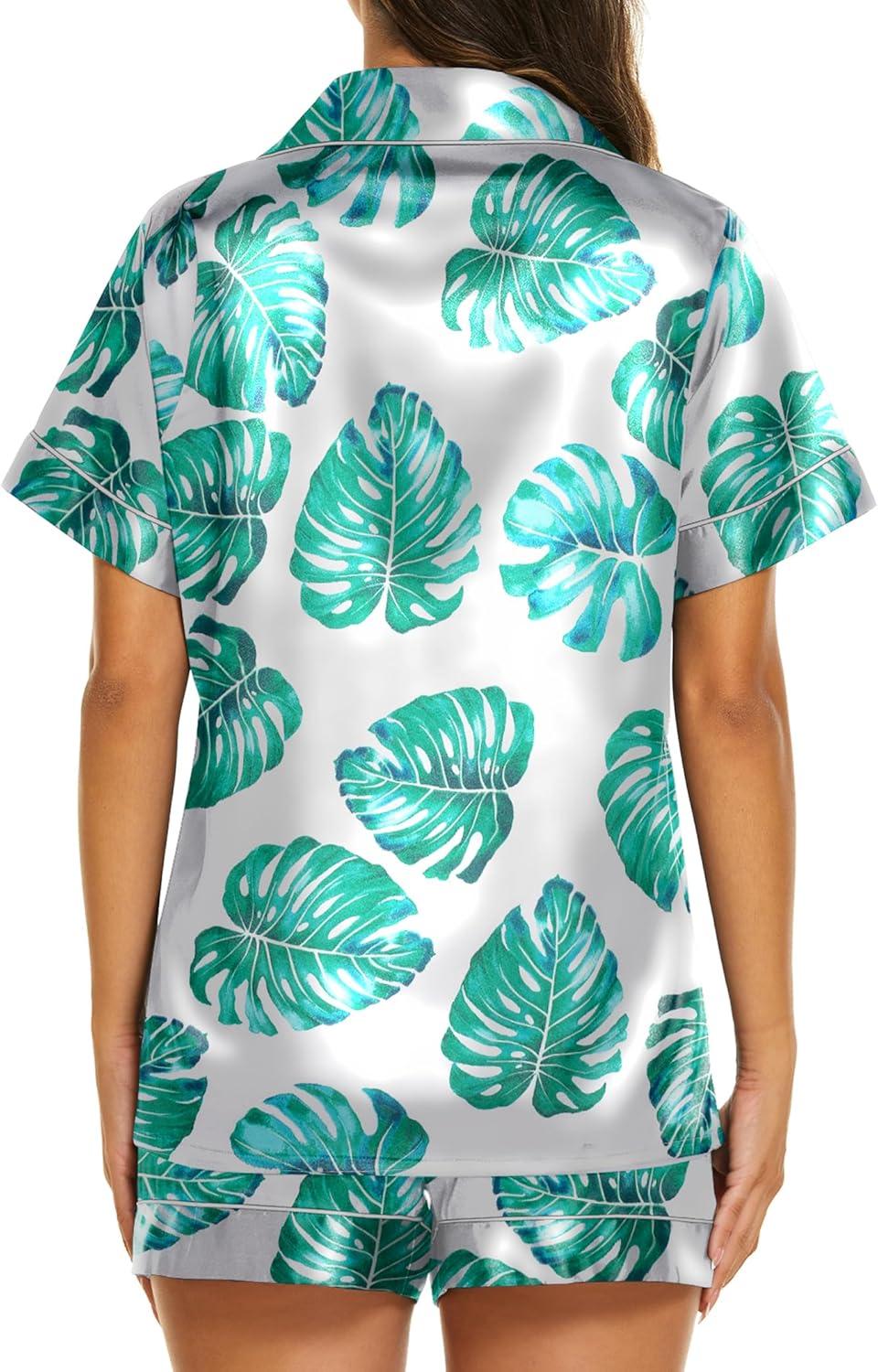 Ekouaer Silk Pajamas for Women Short Sleeve Sleepwear Soft Button Down Loungewear 2 Piece Satin Pjs Shorts Set(Floral Green Leaves)