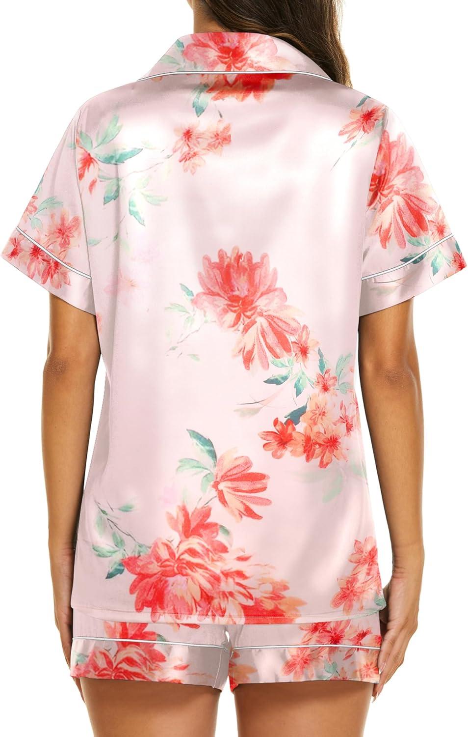 Ekouaer Silk Pajamas for Women Short Sleeve Sleepwear Soft Button Down Loungewear 2 Piece Satin Pjs Shorts Set(Floral Black Pink)