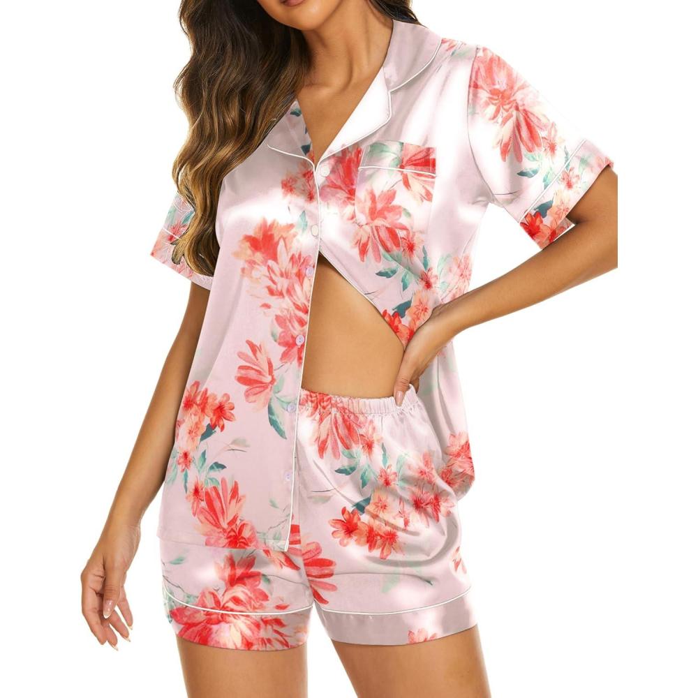 Ekouaer Silk Pajamas for Women Short Sleeve Sleepwear Soft Button Down Loungewear 2 Piece Satin Pjs Shorts Set(Floral Light Pink)