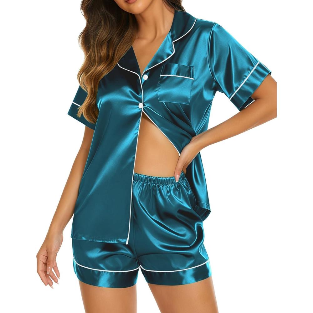 Ekouaer Silk Pajamas for Women Short Sleeve Sleepwear Soft Button Down Loungewear 2 Piece Satin Pjs Shorts Set(Lake Blue)