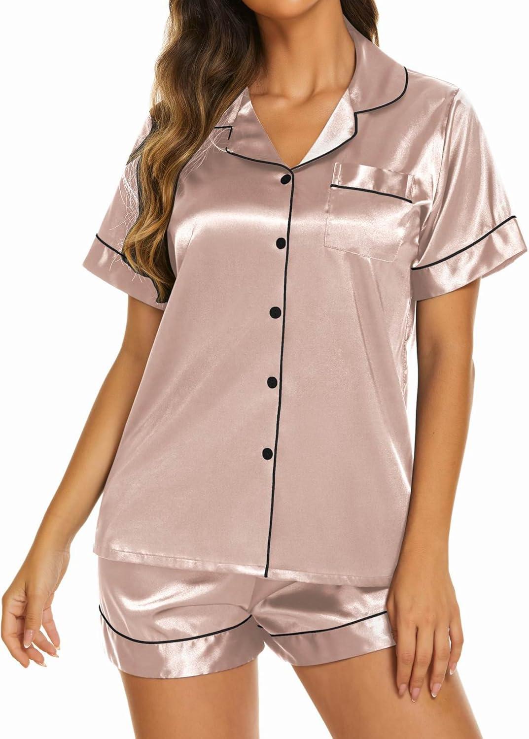 Ekouaer Silk Pajamas for Women Short Sleeve Sleepwear Soft Button Down Loungewear 2 Piece Satin Pjs Shorts Set(Pink)