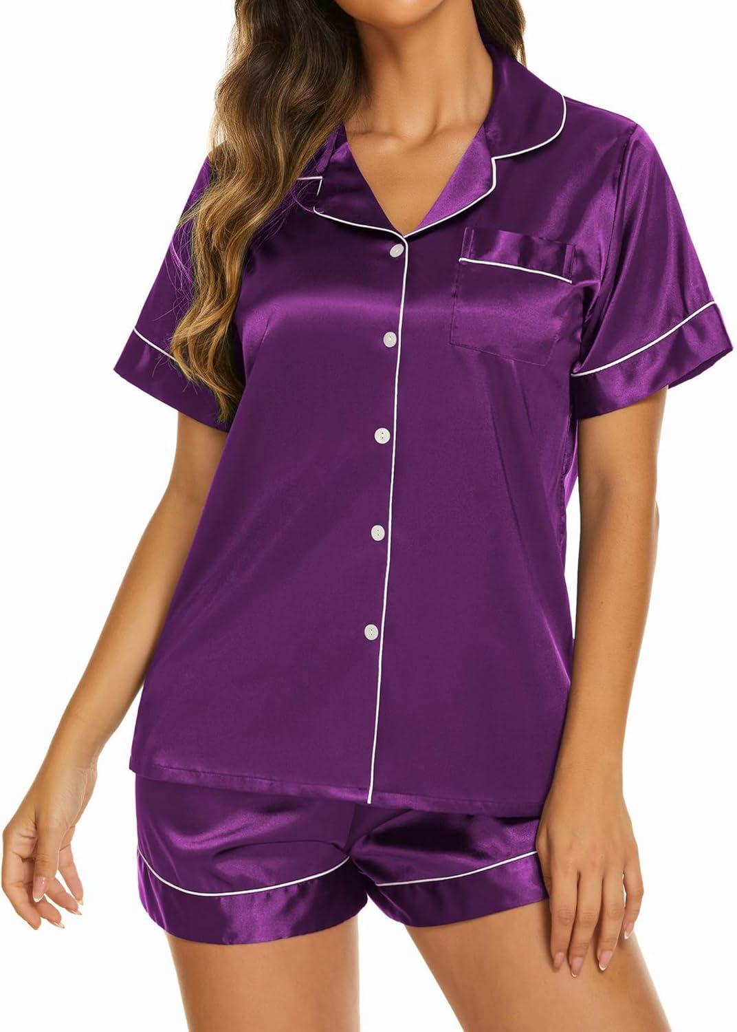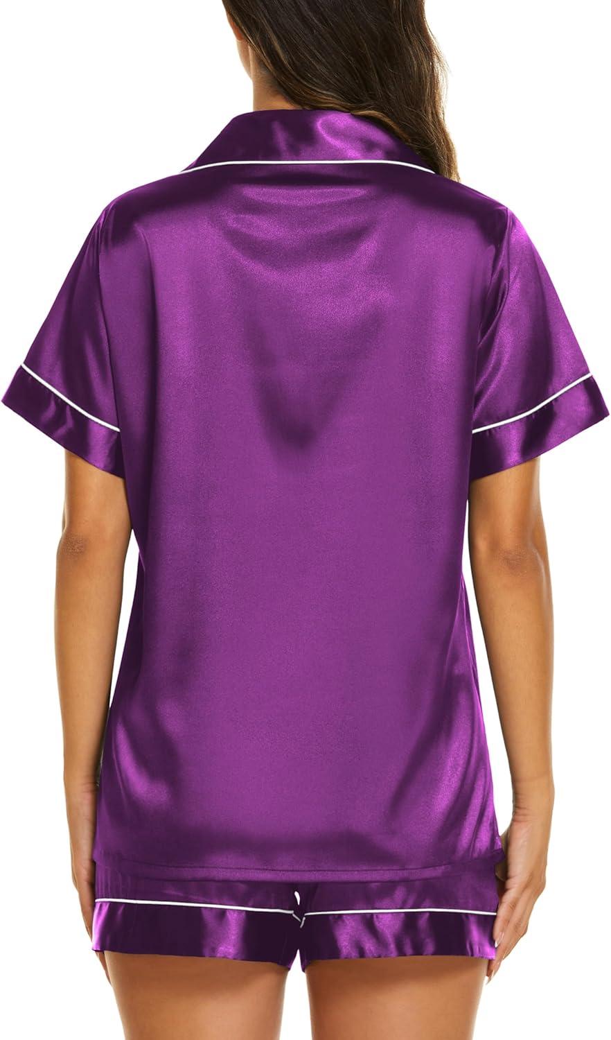 Ekouaer Silk Pajamas for Women Short Sleeve Sleepwear Soft Button Down Loungewear 2 Piece Satin Pjs Shorts Set(Purple)