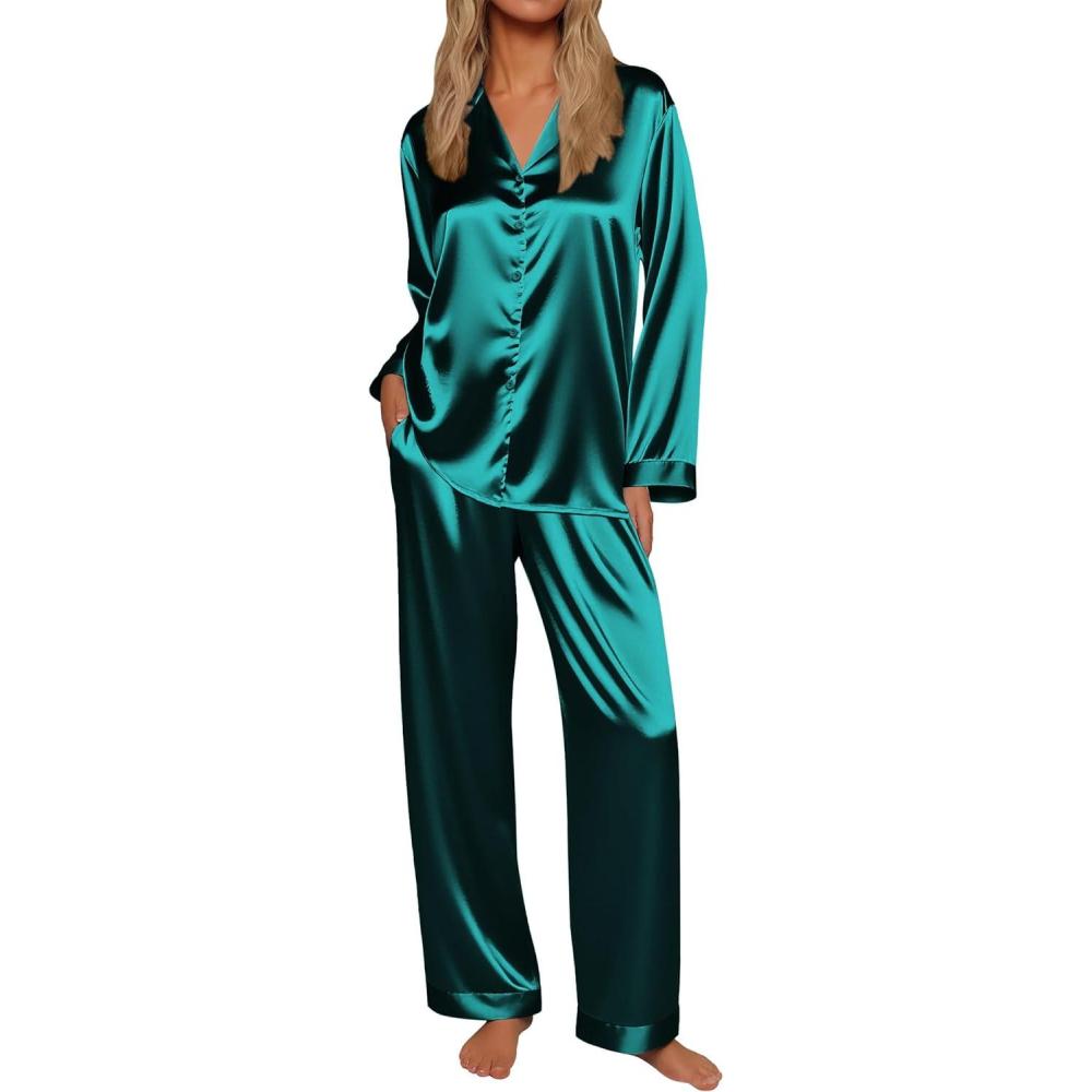 Ekouaer Silk Satin Pajamas for Women Button Down Pjs Set Long Sleeve Loungewear 2 Piece Wide Leg Sleepwear(Blue Green)