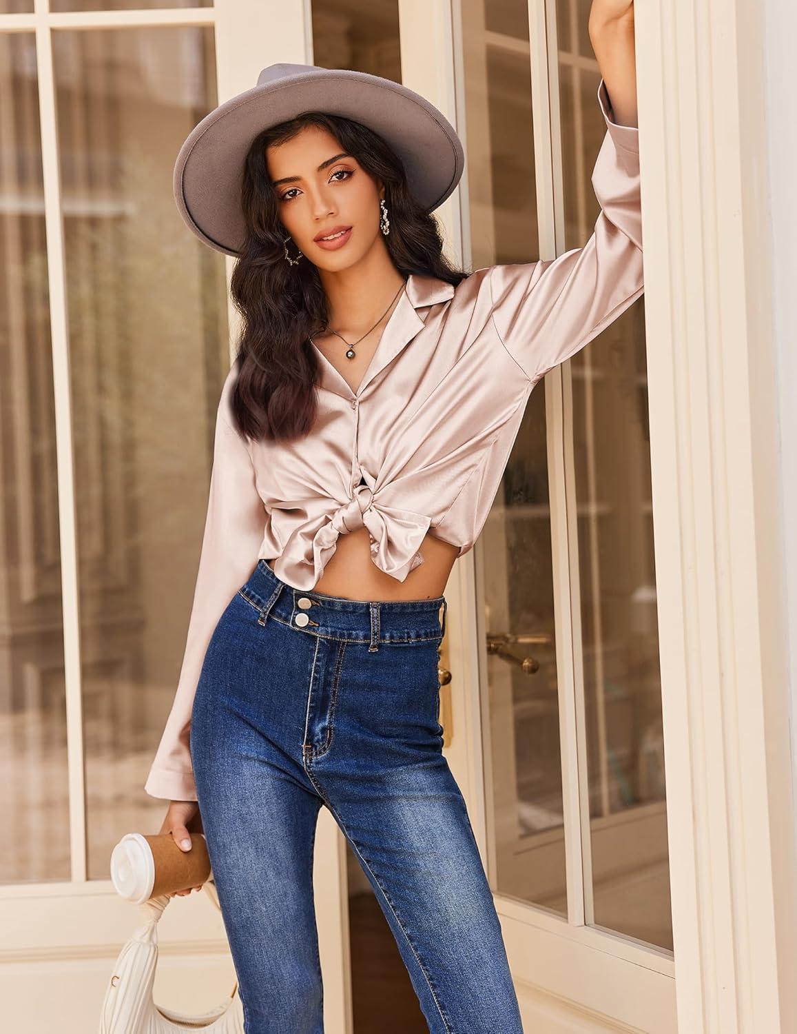 Stylish Button Down Design:The top features a notch collar, long sleeves, and a button-front closure, making it versatile for wear as a chic satin shirt or a jacket over a camisole. Perfect for casual or formal styling.