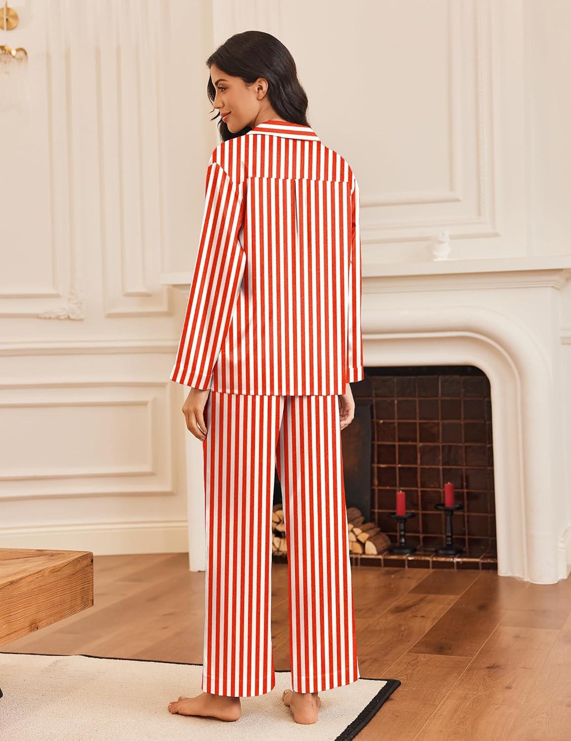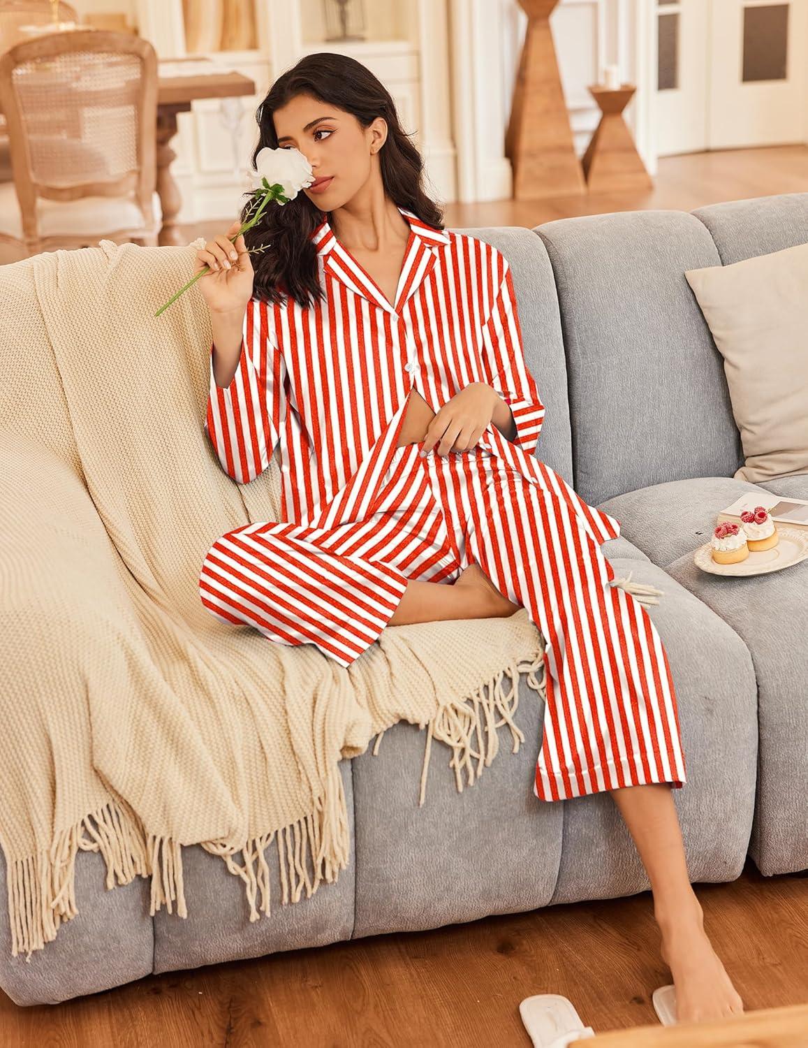 Ekouaer Silk Satin Pajamas for Women Button Down Pjs Set Long Sleeve Loungewear 2 Piece Wide Leg Sleepwear(Red White Stripe)
