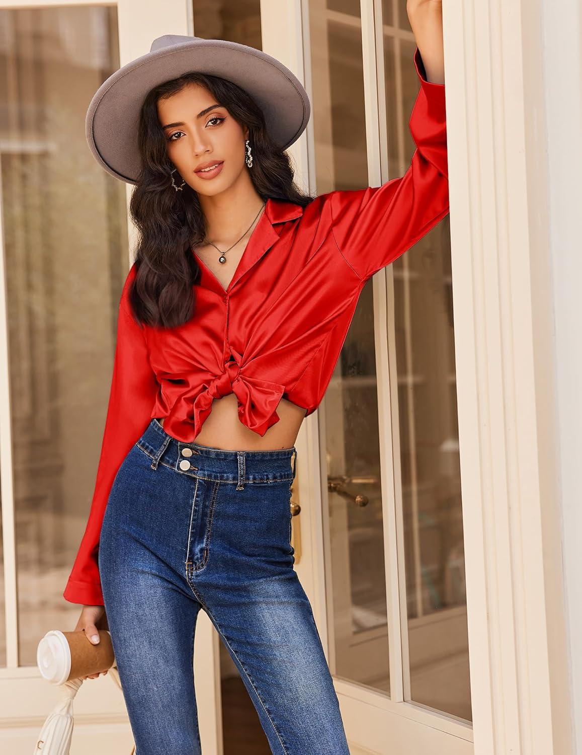 Stylish Button Down Design:The top features a notch collar, long sleeves, and a button-front closure, making it versatile for wear as a chic satin shirt or a jacket over a camisole. Perfect for casual or formal styling.