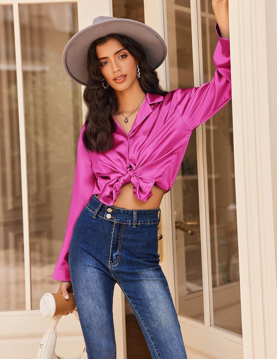 Stylish Button Down Design:The top features a notch collar, long sleeves, and a button-front closure, making it versatile for wear as a chic satin shirt or a jacket over a camisole. Perfect for casual or formal styling.