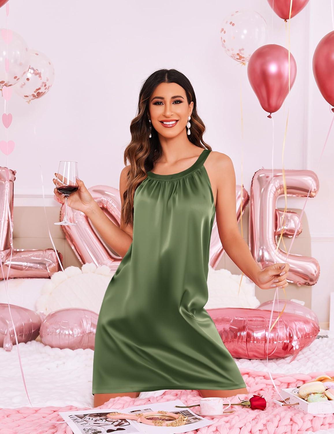 Ekouaer Silky Satin Nightgown for Women Sleeveless Sleepwear Tank O Neck Night Shirts Pleated Sleepshirt Casual Dress S-3XL(Army Green)