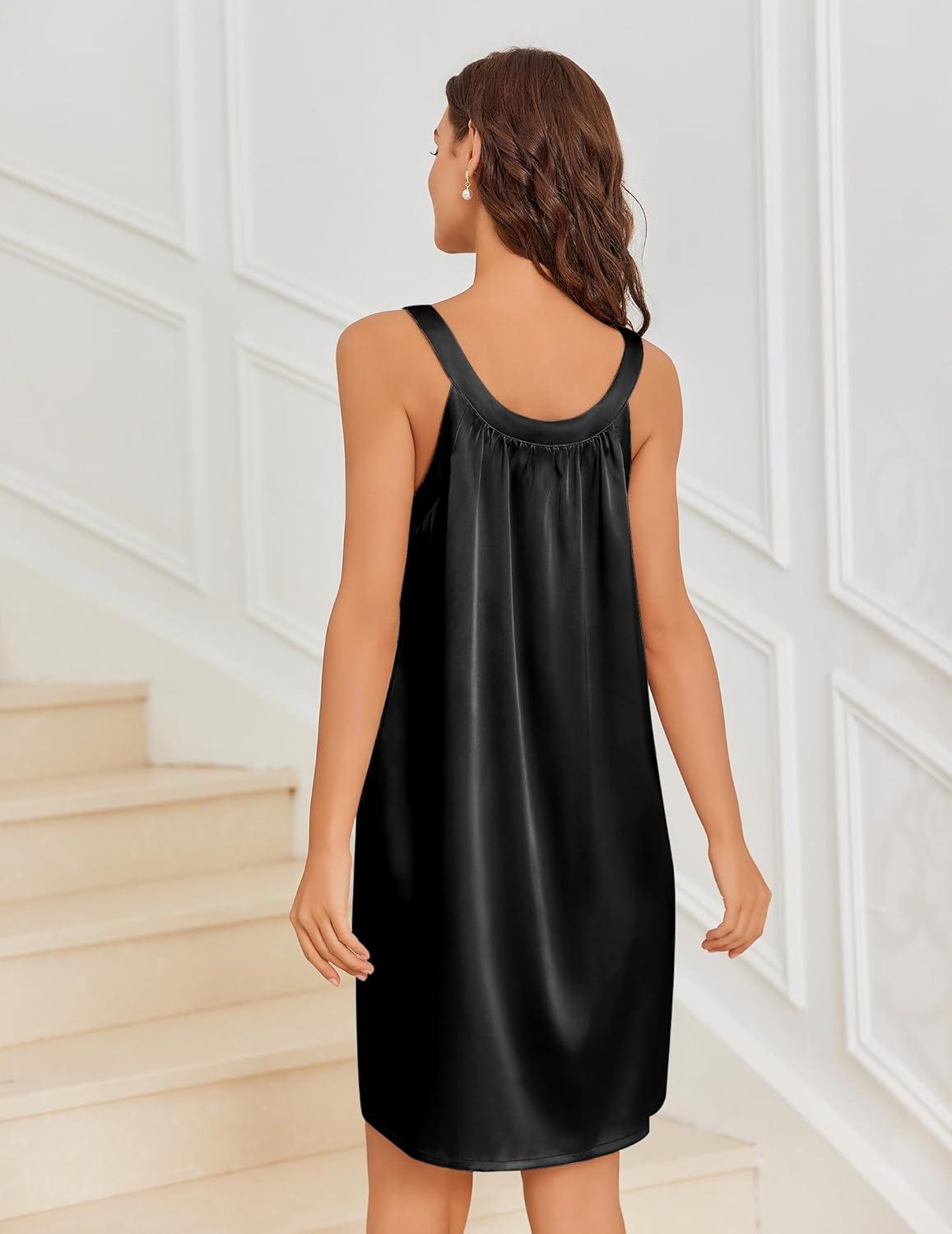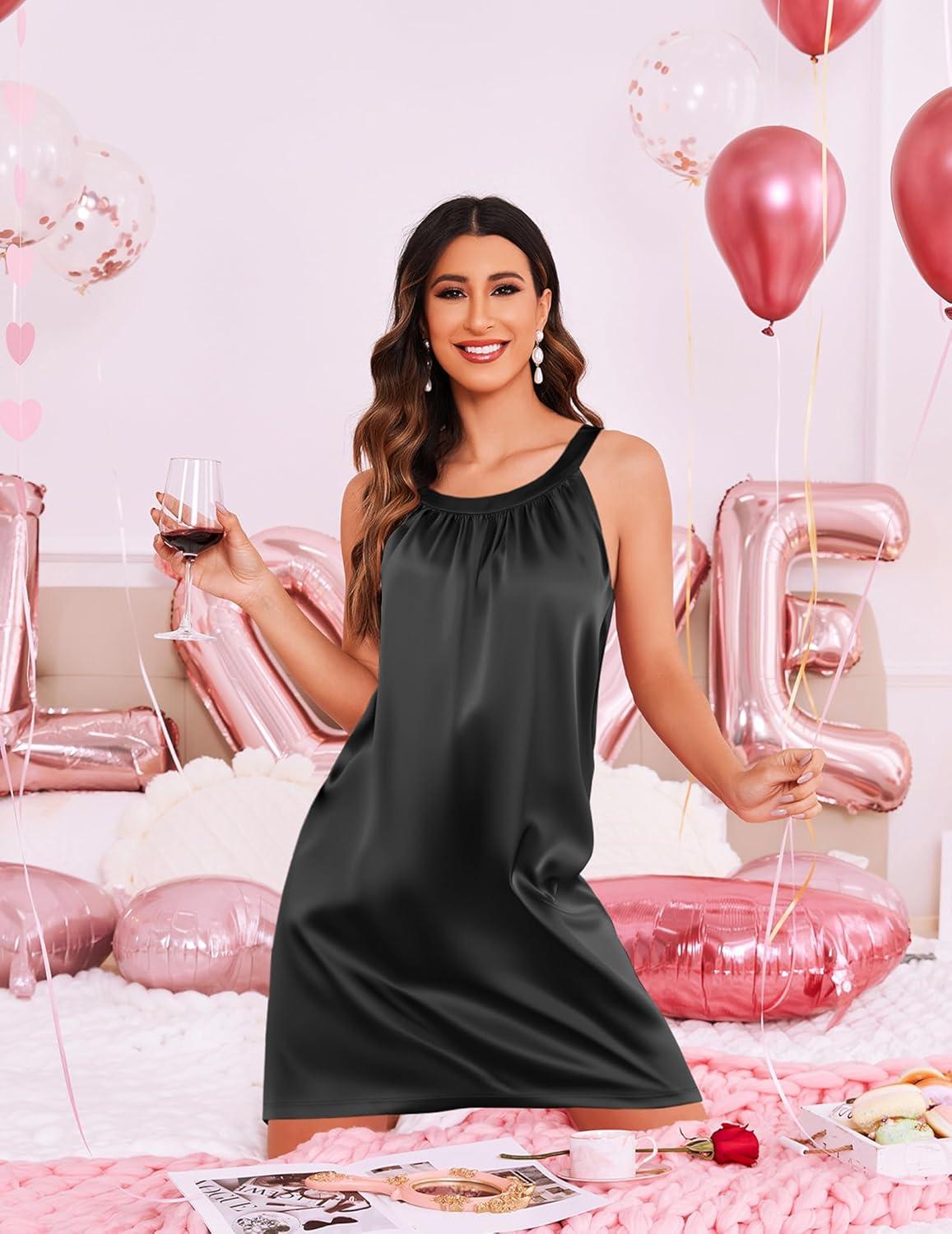Ekouaer Silky Satin Nightgown for Women Sleeveless Sleepwear Tank O Neck Night Shirts Pleated Sleepshirt Casual Dress S-3XL(Black)
