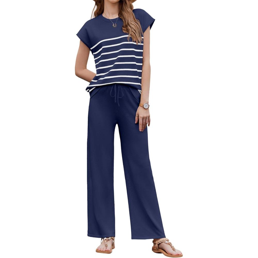 Ekouaer Striped Lounge Set 2 Piece Sweater Matching Outfits Travel Knit Clothing Sets for Women(Navy Blue)