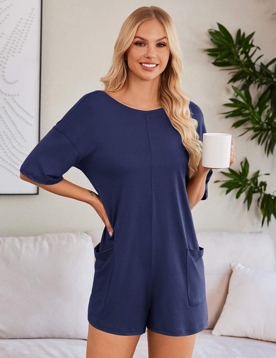 Get up to 60% off on Ekouaer Summer Rompers for Women 2025 Short Sleeve Oversized Reversible Baggy T-shirt Romper Jumpsuit Outfits with Pockets(Navy Blue) styles during our winter sale event.