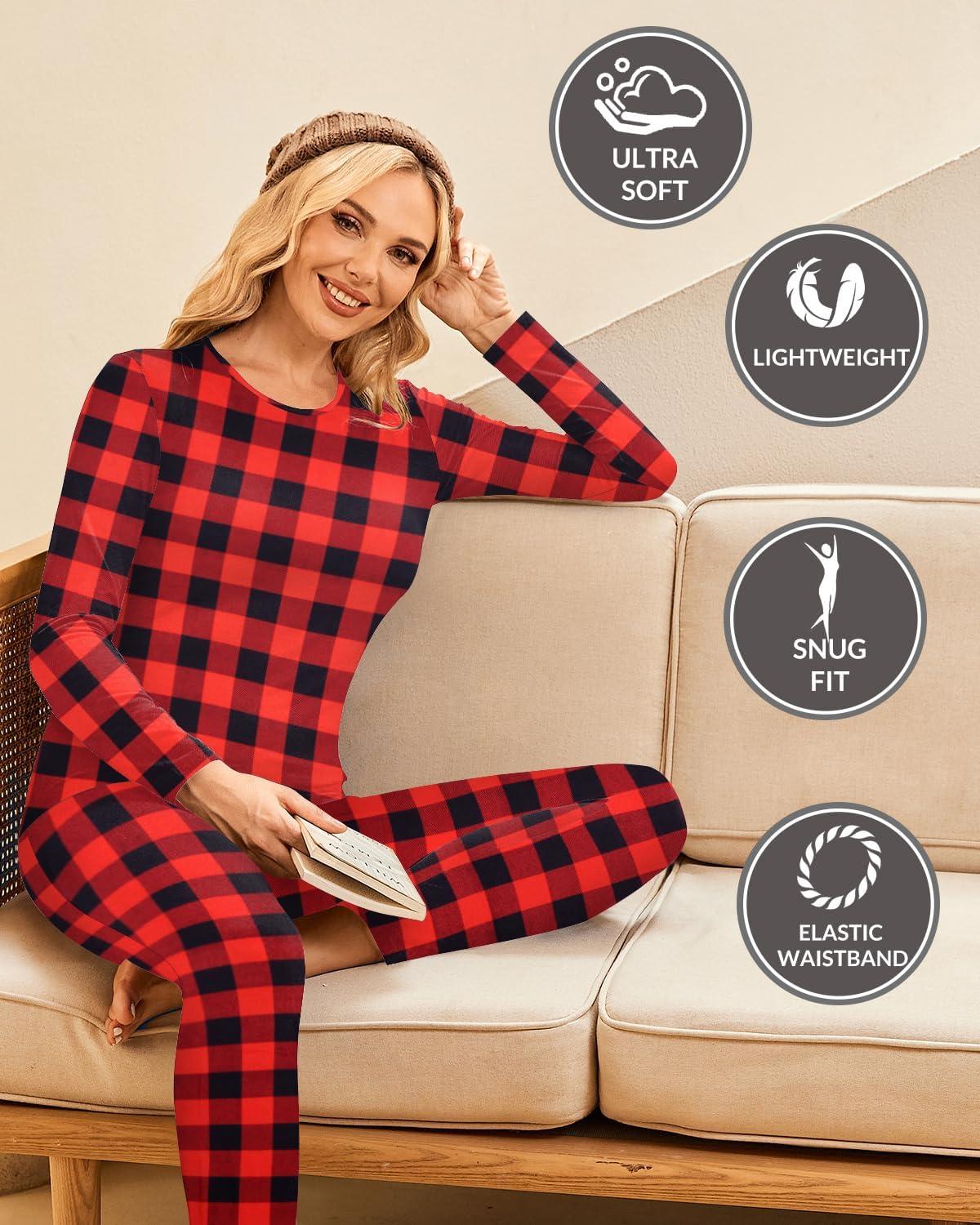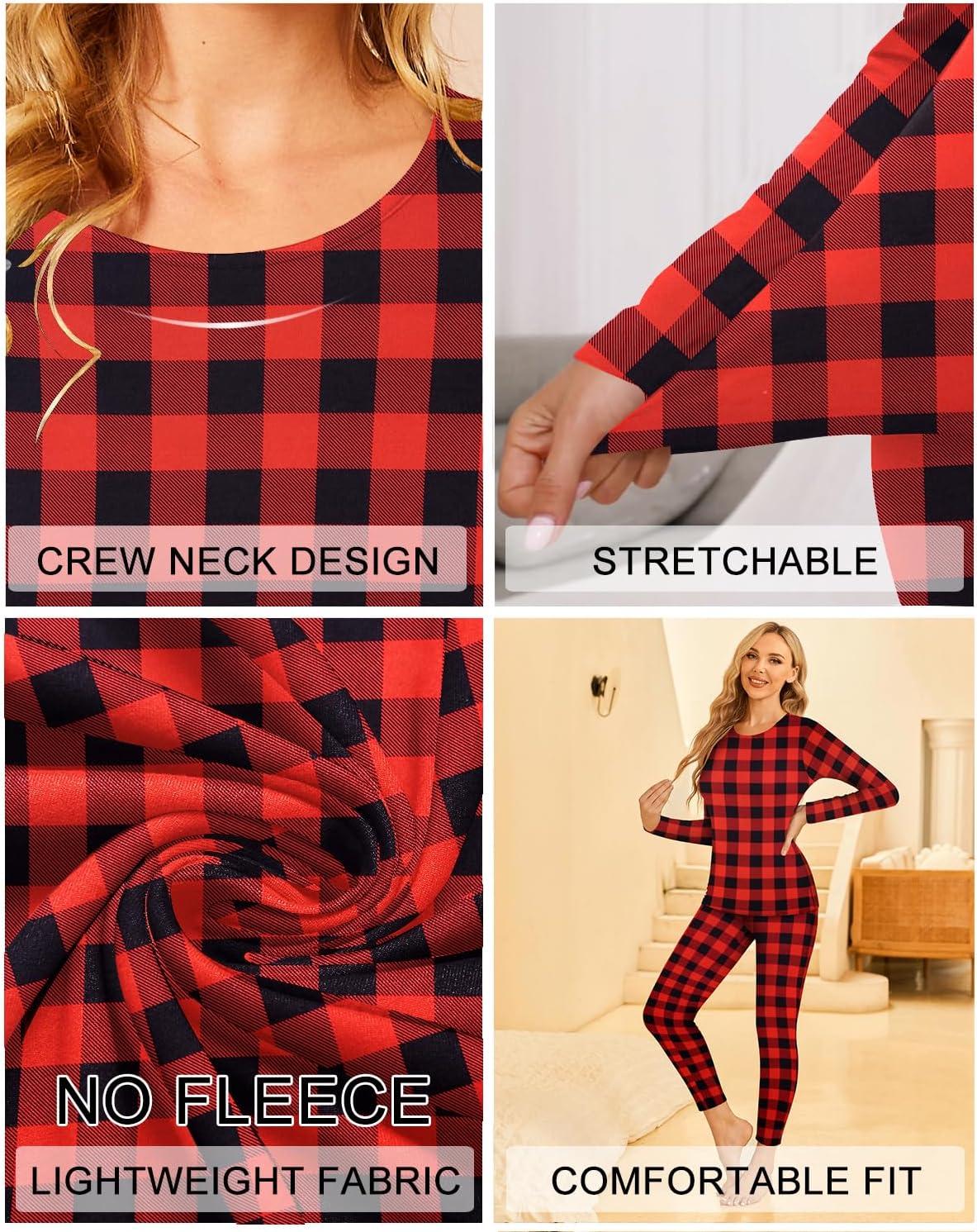imageEkouaer Thermal Underwear for Women Long Johns Sets Base Layer Lightweight 2 Pieces Pajams SetPlaid Red