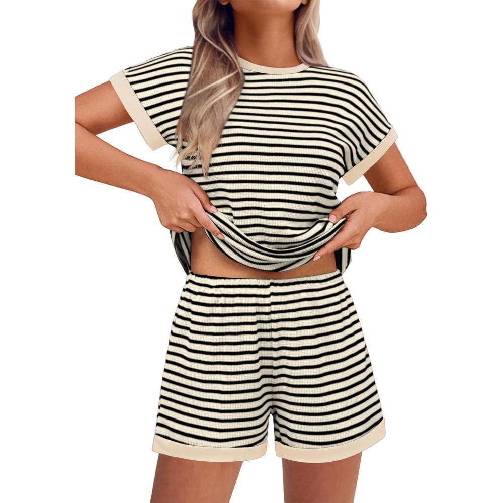 Ekouaer Waffle Knit Lounge Set Women Stripe Pajama Sets Short Sleeve Pj Tops and Shorts Matching loungewear with Pockets(Black Striped)