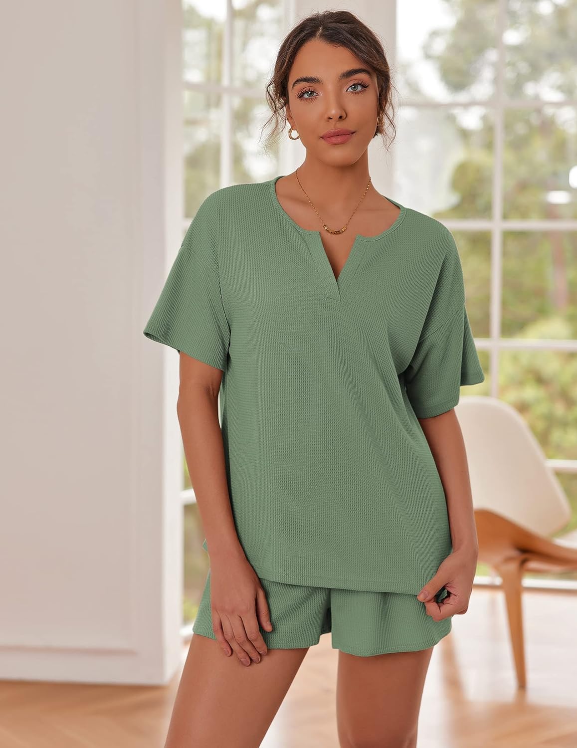 Ekouaer Waffle Knit Pajamas Set Womens Loungewear Short Sleeve Lounge Set 2 Piece PJ Sets S-XXL(Grey Green)