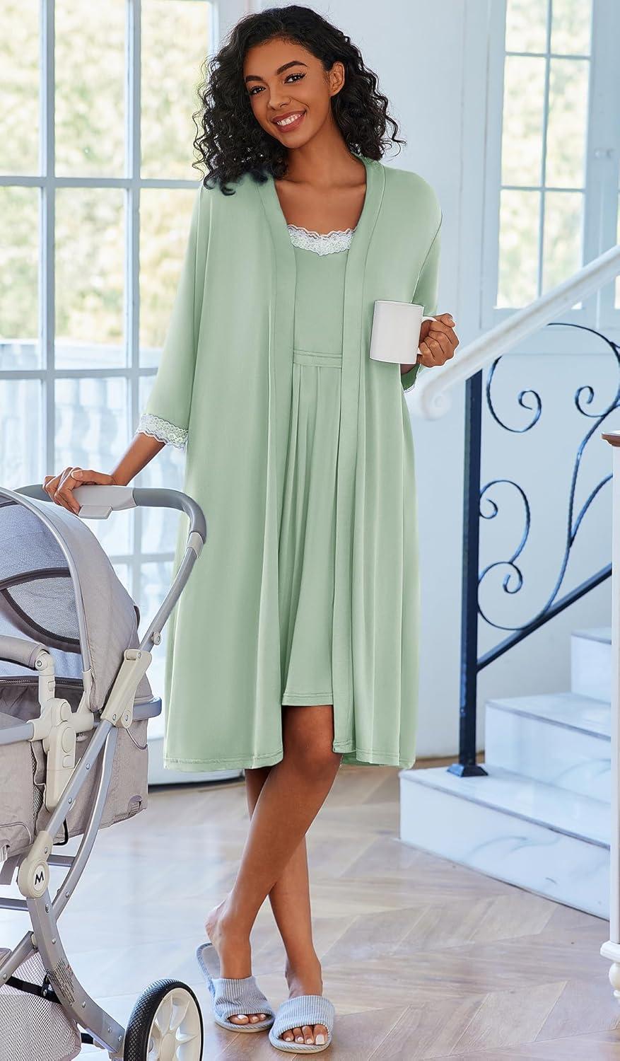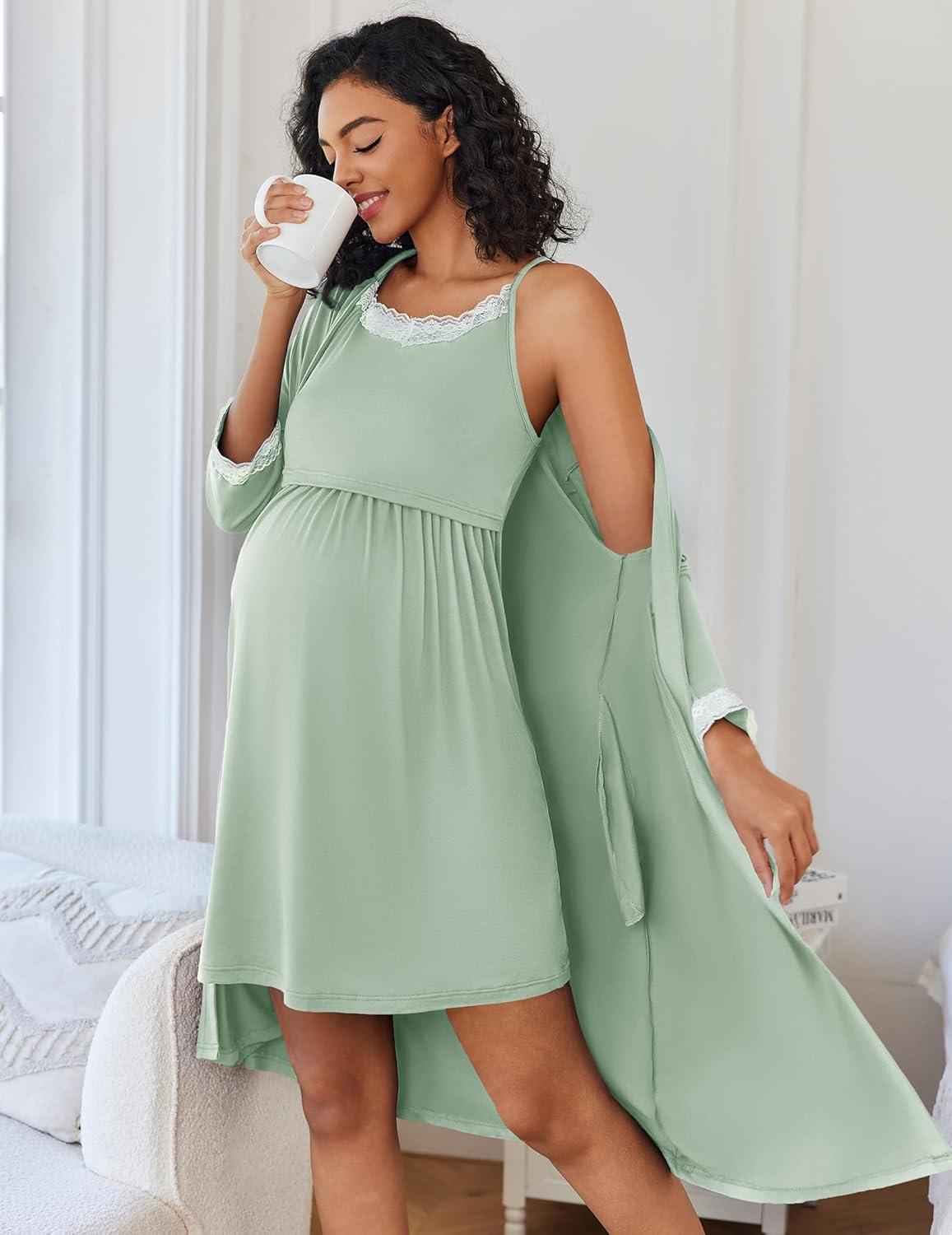 Ekouaer Women Lace Maternity Nursing Gown and 3/4 Sleeve Robe Set Double Layer Breastfeeding Nightgown Slip Dress & Bathrobe(Light Green)
