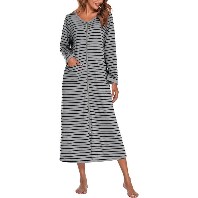 Ekouaer Women Long House Coat Zipper Front Robes Full Length Nightgowns with Pockets Striped Loungewear S-4XL(A-stripe-pt3)
