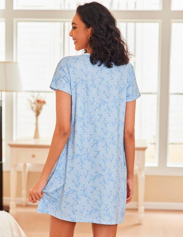 Ekouaer Women Nightgowns Short Sleeve Sleepwear Soft Pajama Dress Sleep Shirt Nightshirt S-2XL(Light Blue Print)