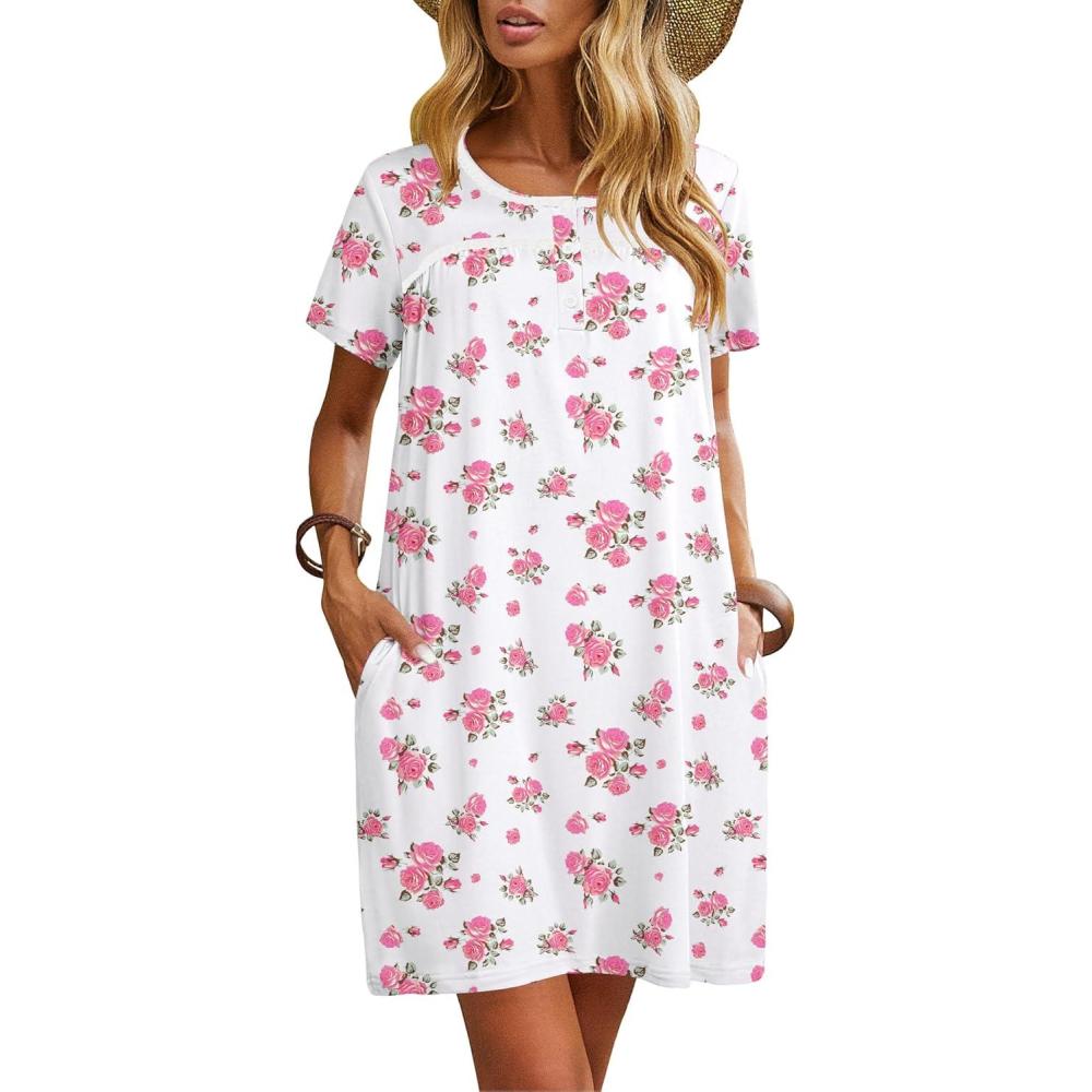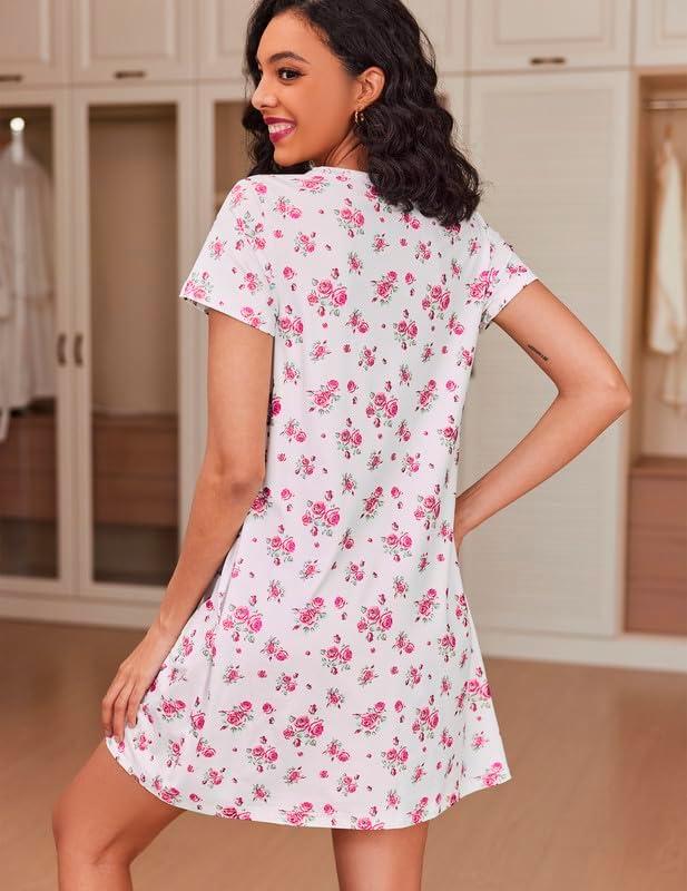 Ekouaer Women Nightgowns Short Sleeve Sleepwear Soft Pajama Dress Sleep Shirt Nightshirt S-2XL(Pink Print)