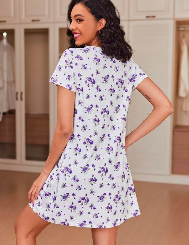 Ekouaer Women Nightgowns Short Sleeve Sleepwear Soft Pajama Dress Sleep Shirt Nightshirt S-2XL(Purple Print)