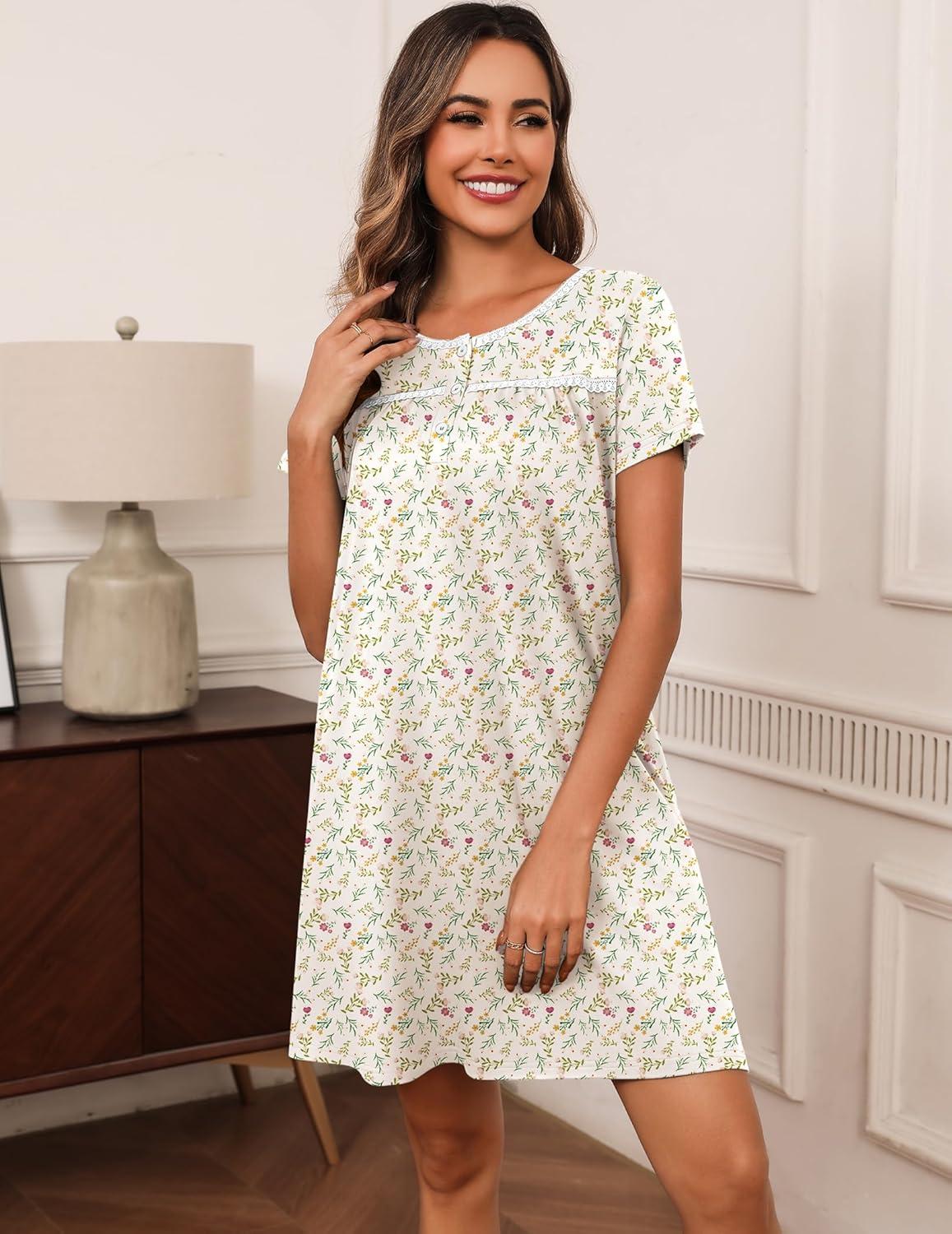 Ekouaer Women Nightgowns Short Sleeve Sleepwear Soft Pajama Dress Sleep Shirt Nightshirt S-2XL(White Flower)