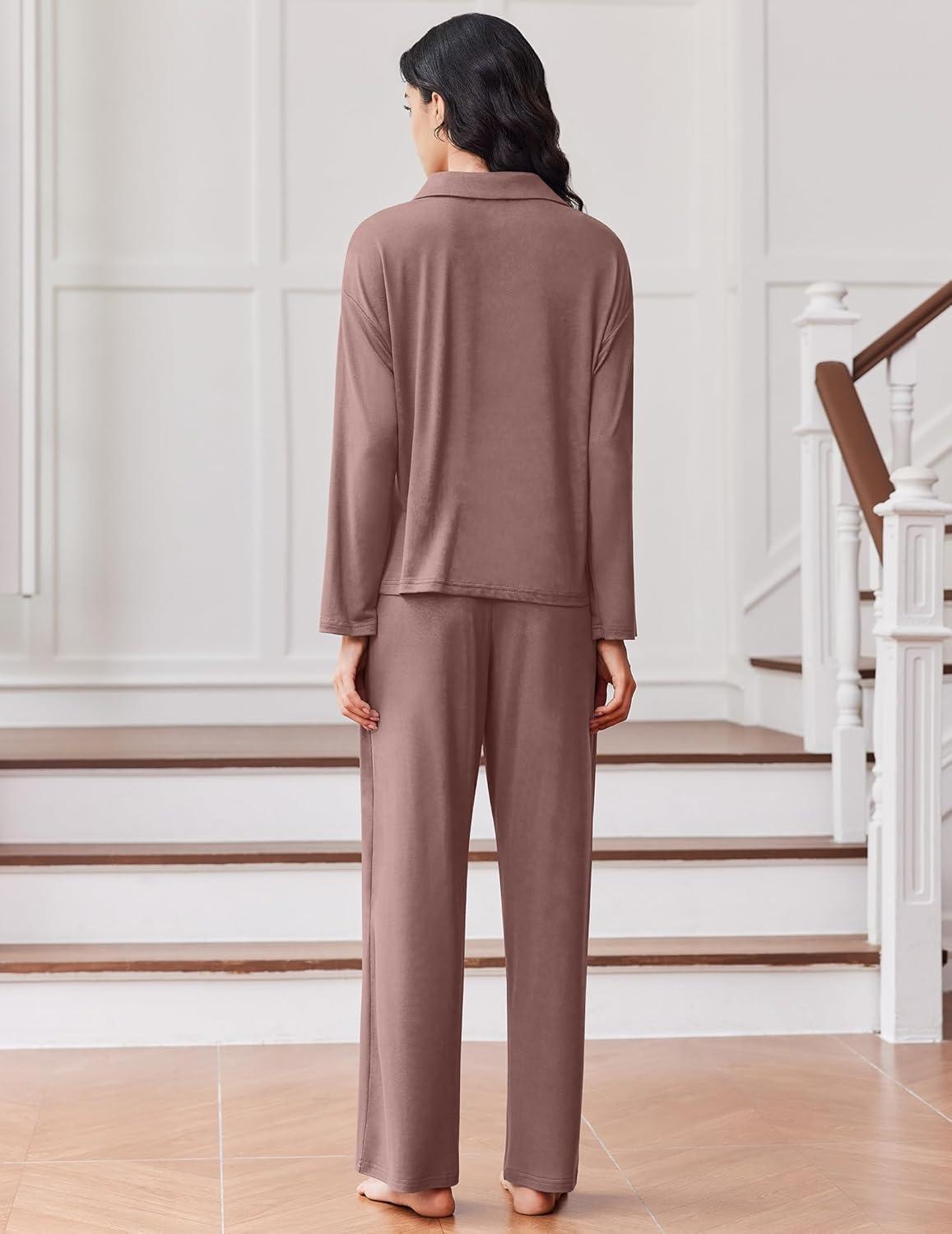 imageEkouaer Women Pajamas Set Long Sleeve Sleepwear Button Down Pjs Soft 2 Piece Loungewear with Long PantsBrown