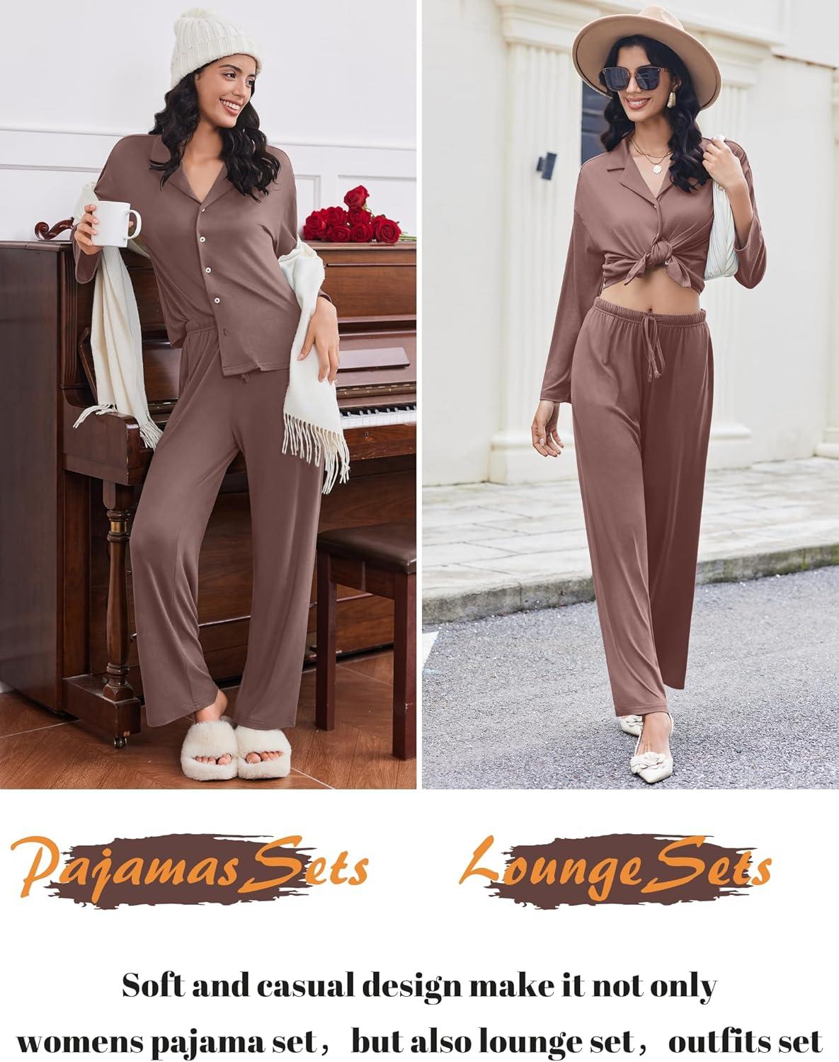 Ekouaer Women Pajamas Set Long Sleeve Sleepwear Button Down Pjs Soft 2 Piece Loungewear with Long Pants(Brown)