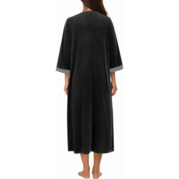 Ekouaer Women Zipper Robe 3/4 Sleeves Loungewear Dress Full Length Sleepwear Pockets Housecoat Nightgown Long Bathrobe(Style 2-velour-black)