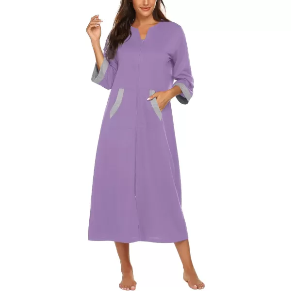 Ekouaer Women Zipper Robe 3/4 Sleeves Loungewear Dress Full Length Sleepwear Pockets Housecoat Nightgown Long Bathrobe(Style 1:purple)