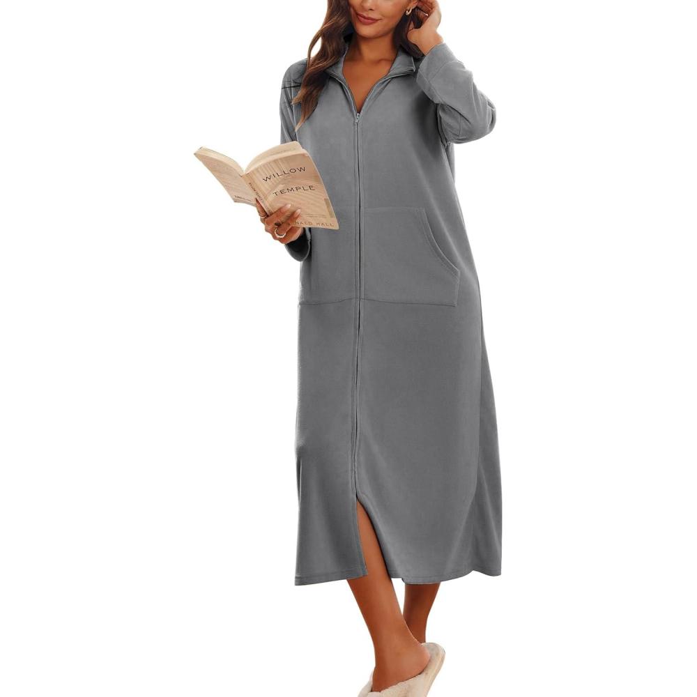 Ekouaer Women Zipper Robe Long Sleeves House Coat Soft Bathrobe Sleepwear with Pockets Housecoat Loungewear(Dark Gray)