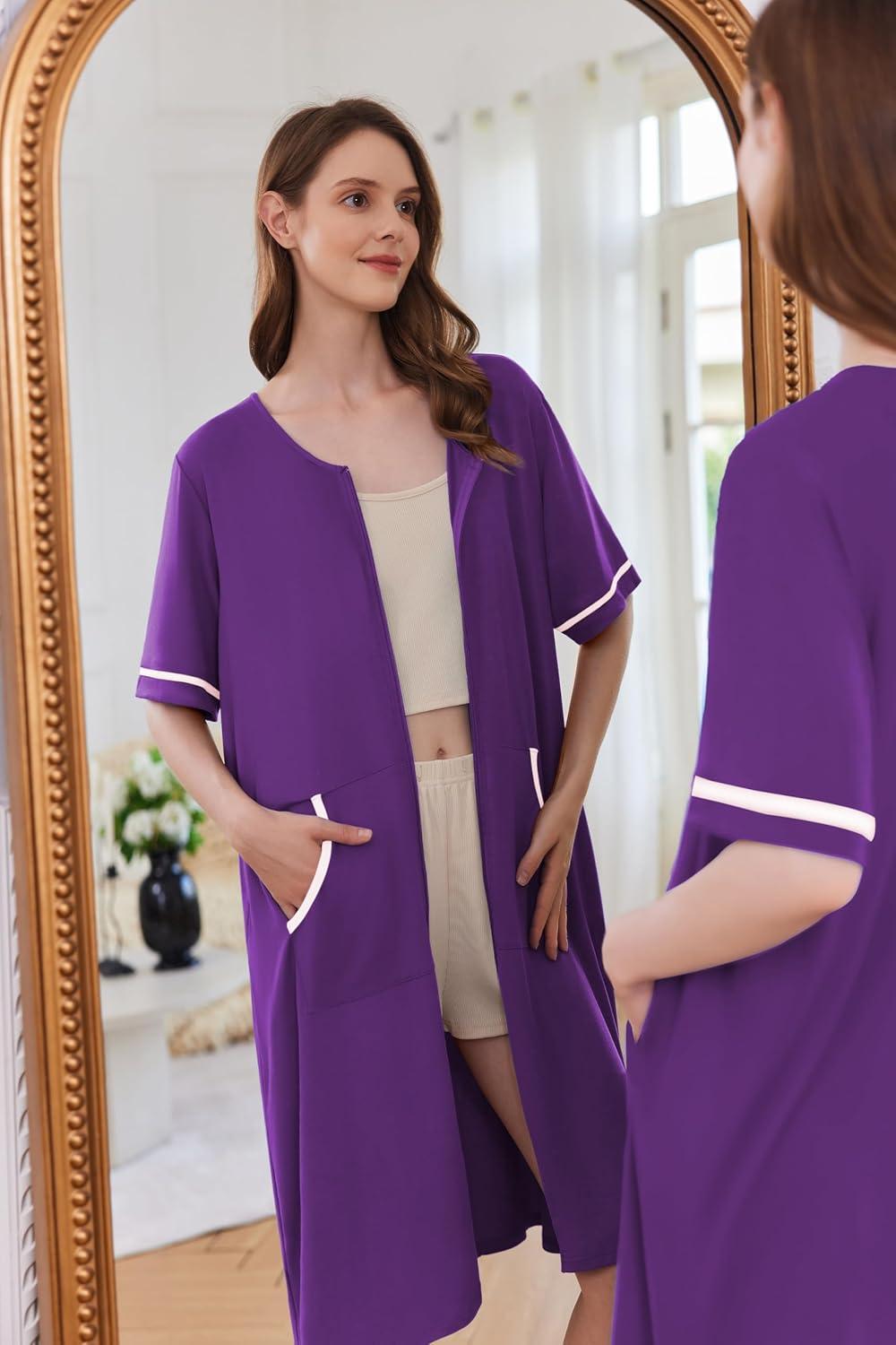 Ekouaer Women Zipper Robe Short Sleeve Duster Housecoat Short Bathrobes Zip Front Nightgown with Pockets S-3XL(Purple)