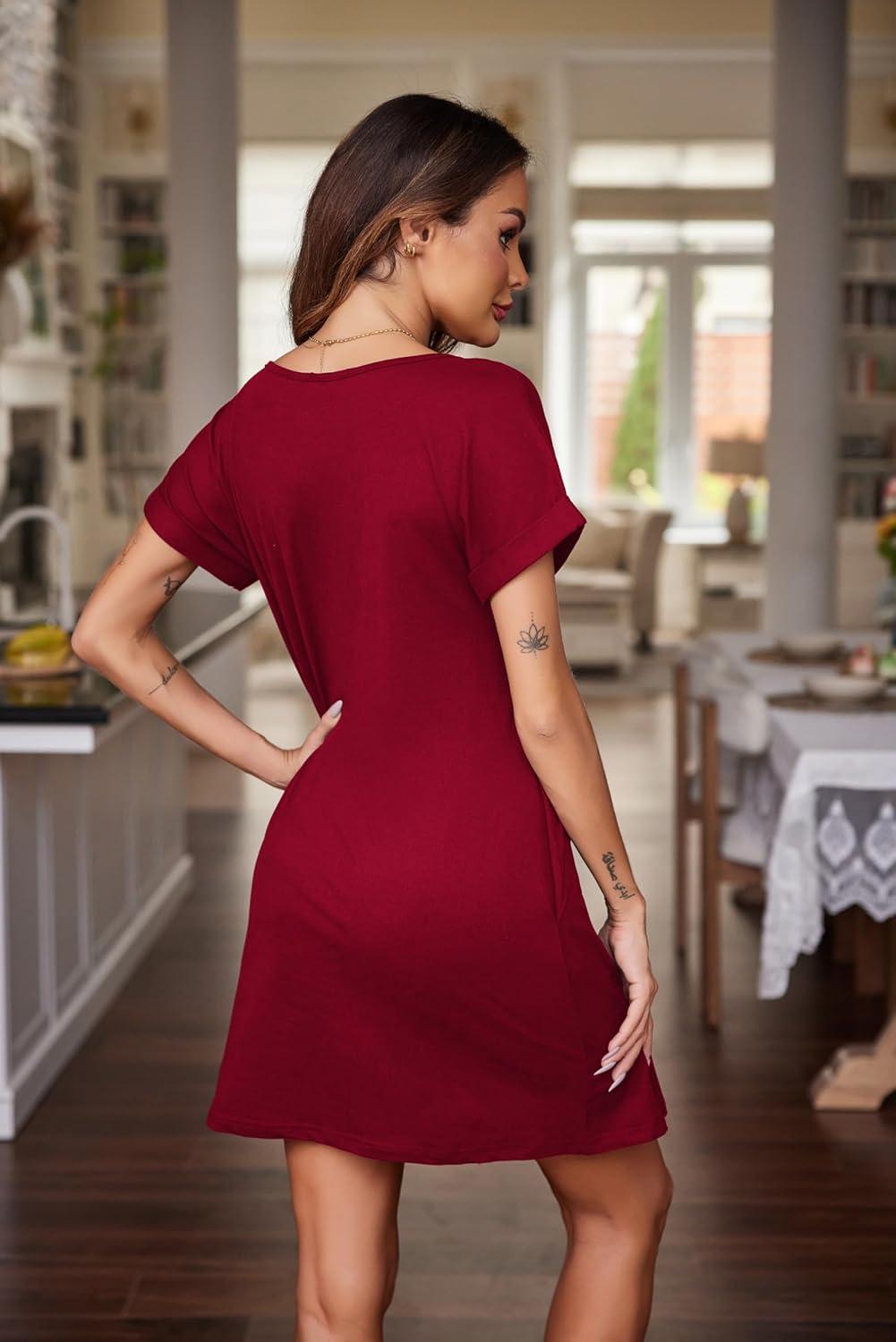 imageEkouaer Womens 2 Pack Nightgown V Neck Sleepshirt Short Sleeve Nightshirt Soft Sleep Dress with PocketsLeafwine Red