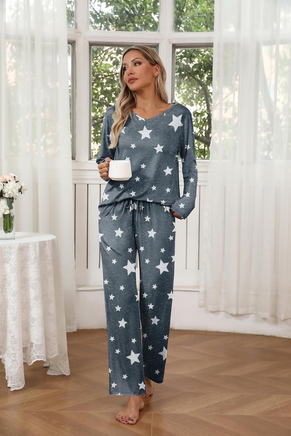 Ekouaer Womens 2 Pack Pajama Set Long Sleeve Pajamas Top and Pants V Neck Pjs Set Soft Loungewear with Pockets(Gray Star White Geometric Patterns)