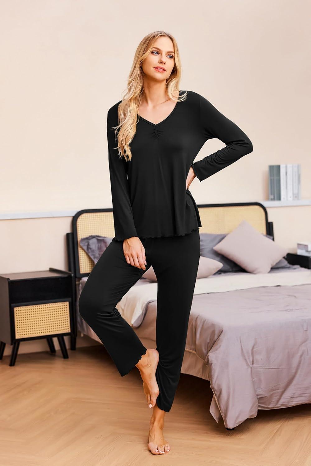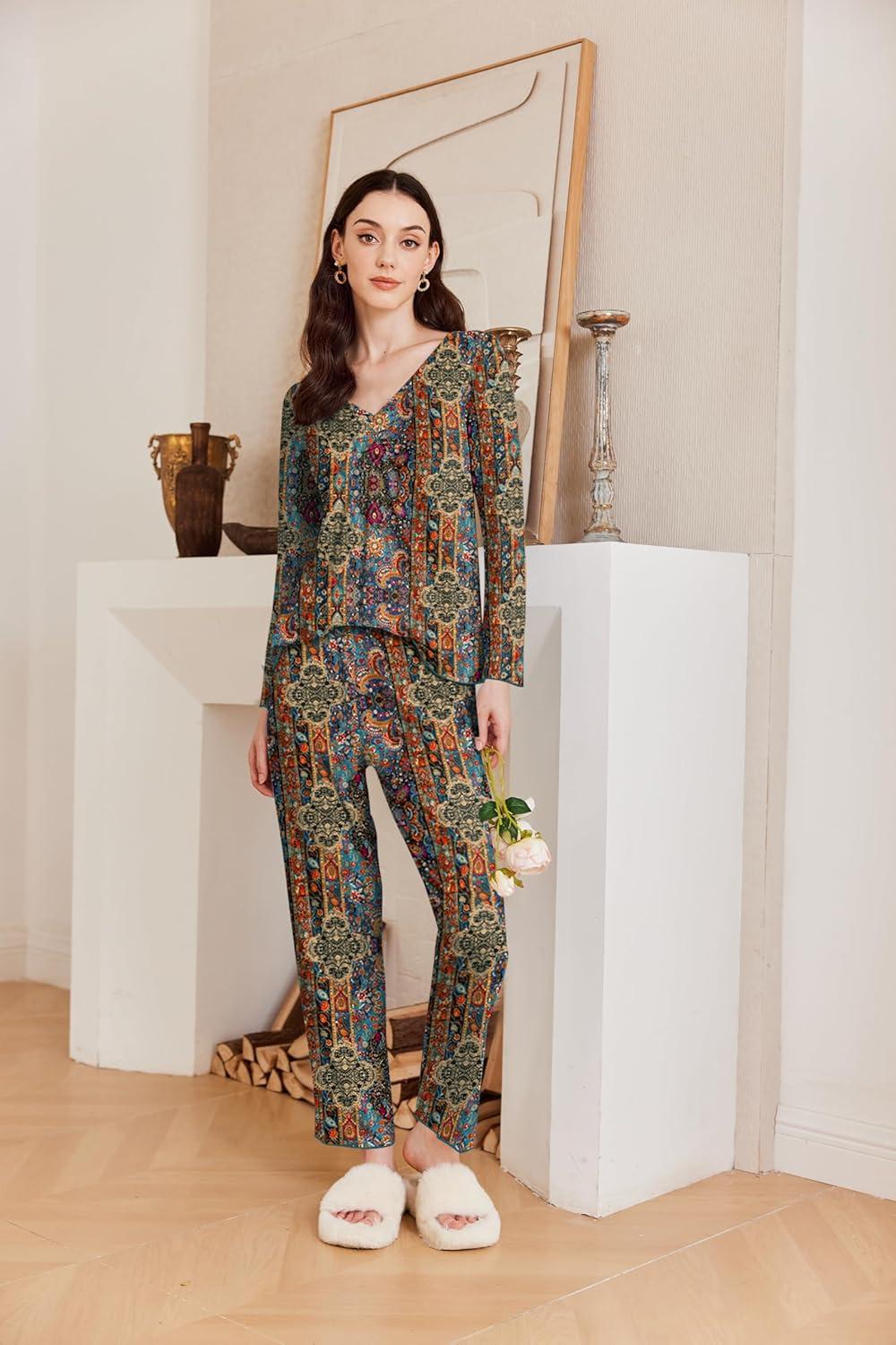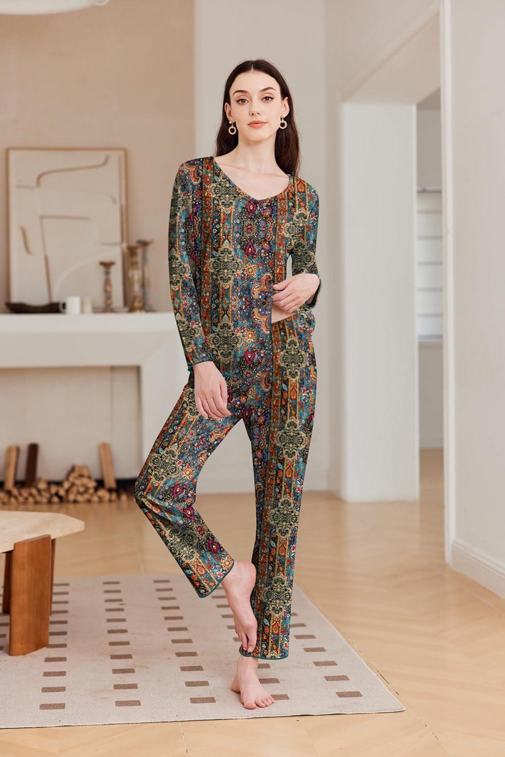 imageEkouaer Womens 2 Pack Pajama Set Long Sleeve Pajamas Top and Pants V Neck Pjs Set Soft Sleepwear LoungewearBlack  Bohemia