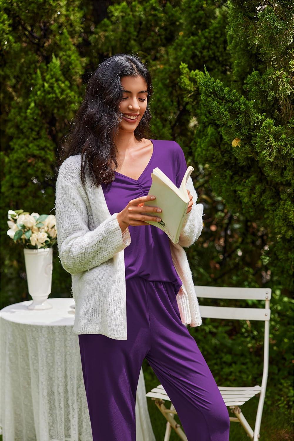Ekouaer Womens 2 Pack Pajama Set Long Sleeve Pajamas Top and Pants V Neck Pjs Set Soft Sleepwear Loungewear(Black + Purple)