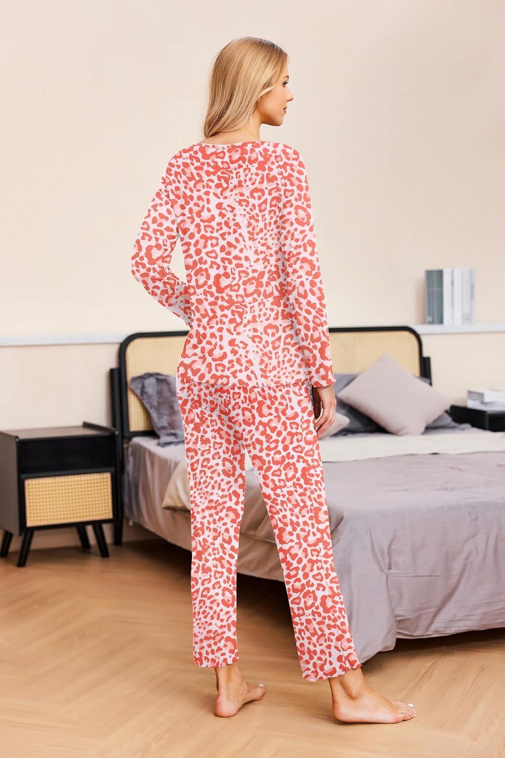 imageEkouaer Womens 2 Pack Pajama Set Long Sleeve Pajamas Top and Pants V Neck Pjs Set Soft Sleepwear LoungewearLeopard Red  Little Daisy