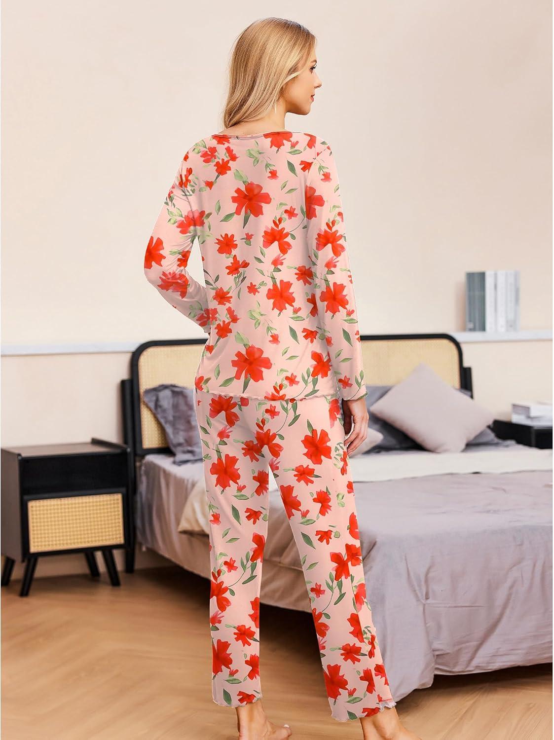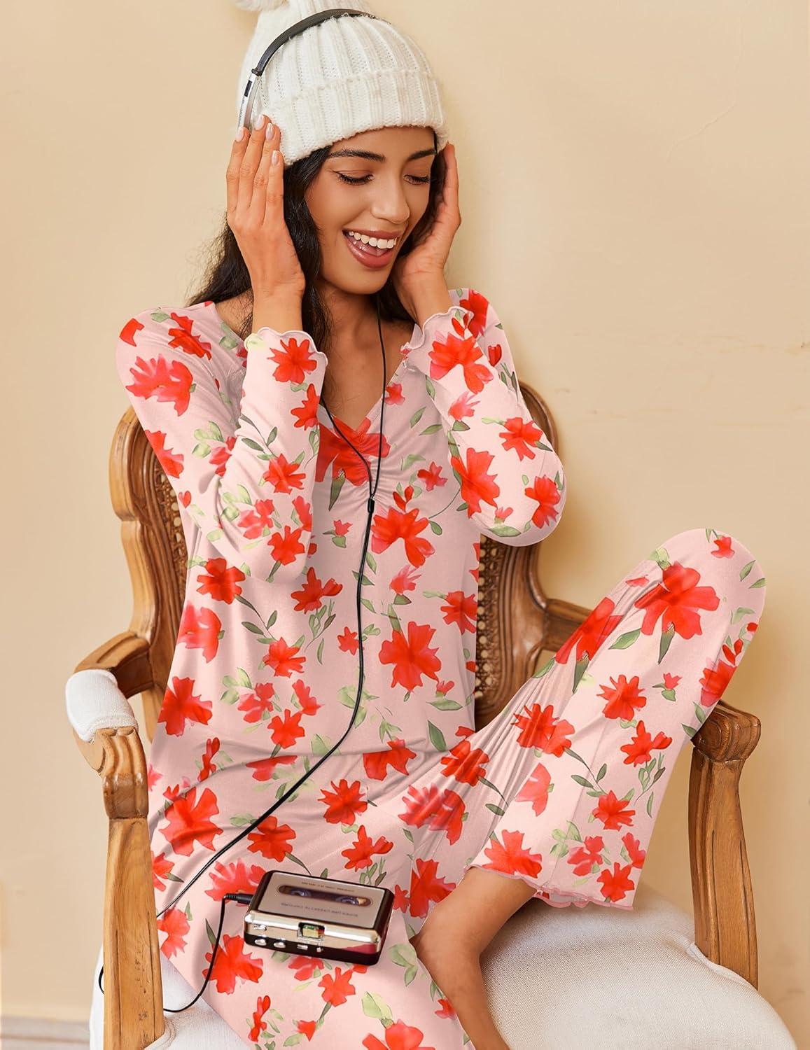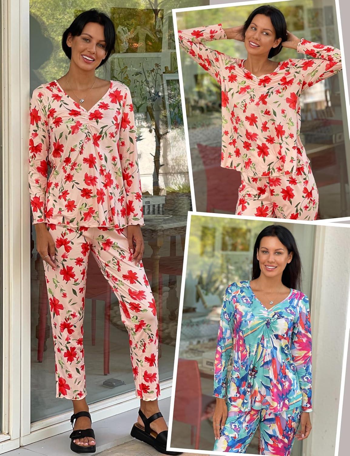 Ekouaer Womens 2 Pack Pajama Set Long Sleeve Pajamas Top and Pants V Neck Pjs Set Soft Sleepwear Loungewear(Red Flowers + Tie-dye Flowers)