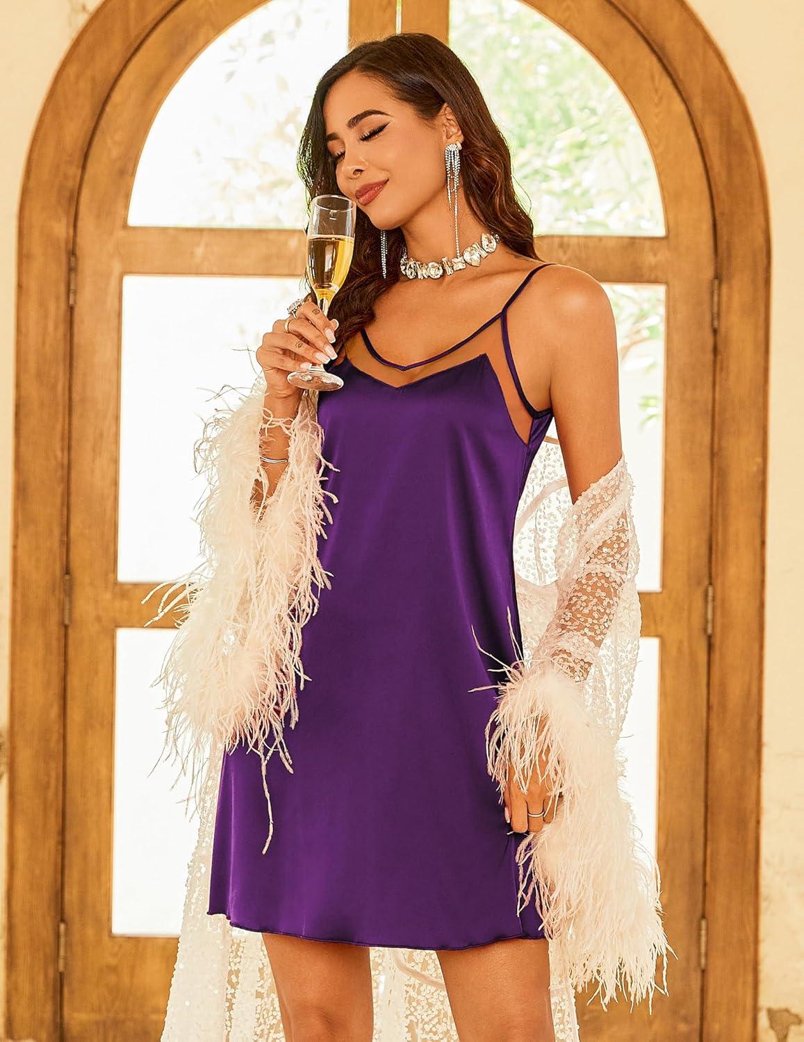 Ekouaer Womens 2 Pack Silky Nightgowns Sexy Lingerie Sleepwear Satin Negligee Chmeise Nighty Mesh V Neck Nightwear(Purple/Rose Red)