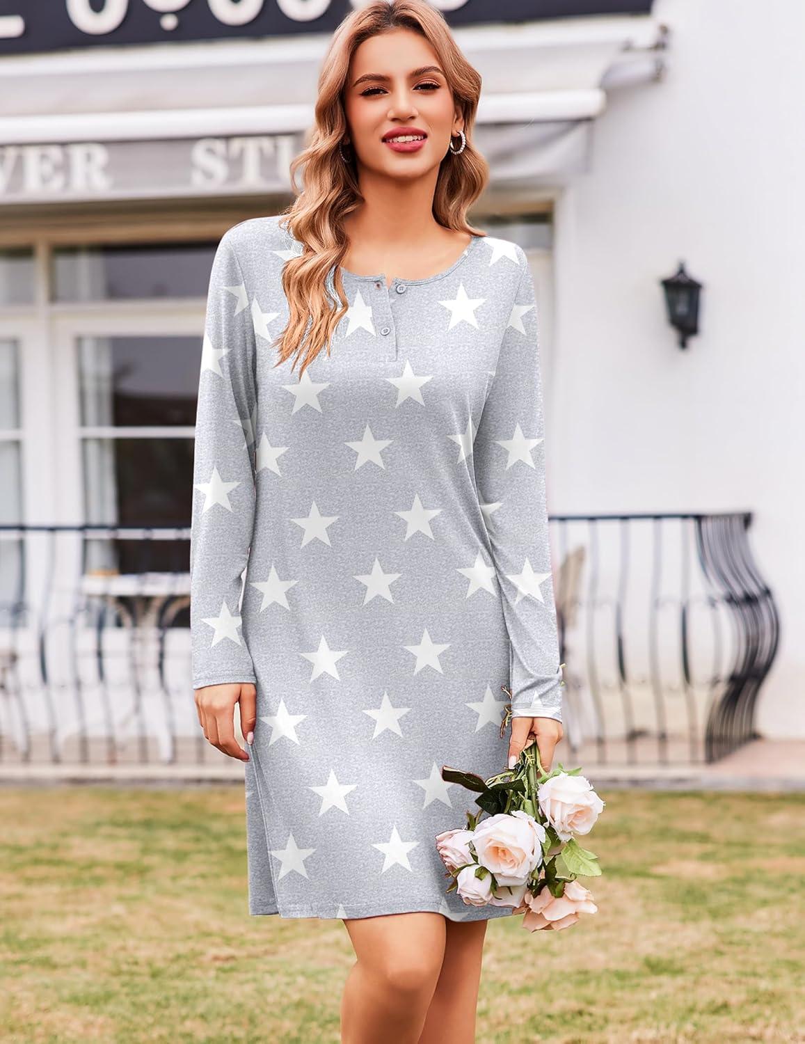 Ekouaer Women's 2 Pack Sleepshirt Dress Comfortable Nightshirt Nightgown Long Sleeve Button Down Sleepwear(Black stars)