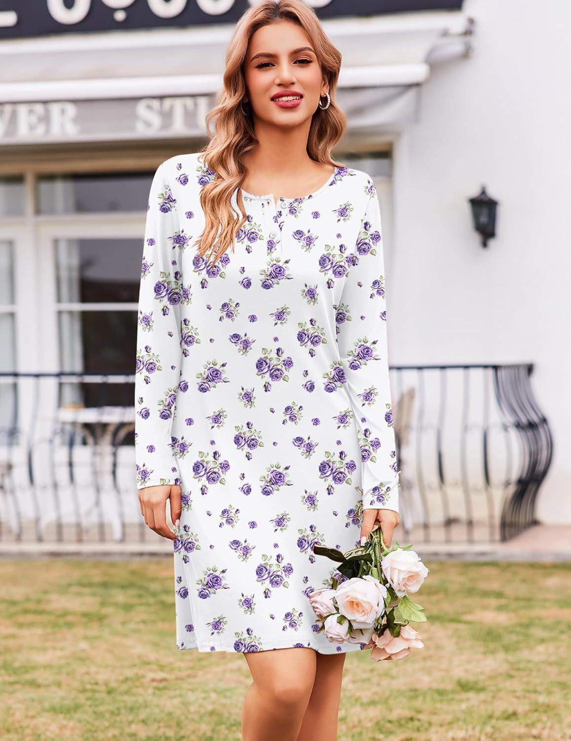 Ekouaer Women's 2 Pack Sleepshirt Dress Comfortable Nightshirt Nightgown Long Sleeve Button Down Sleepwear(Blue White Floral white Purple Floral)