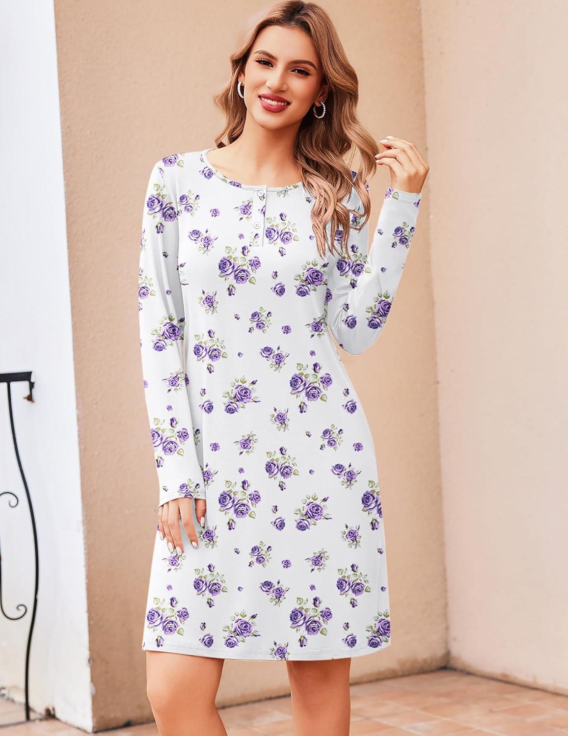 Ekouaer Women’s 2 Pack Sleepshirt Dress Comfortable Nightshirt Nightgown Long Sleeve Button Down Sleepwear(Blue White Floral purple Floral)