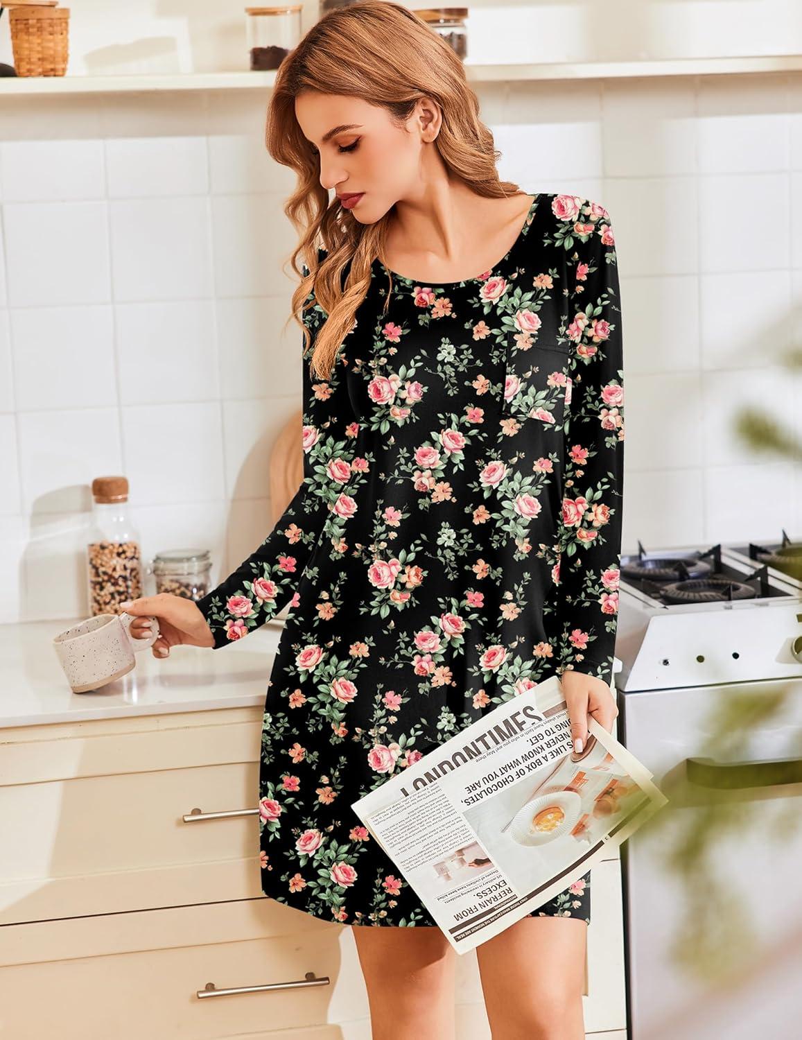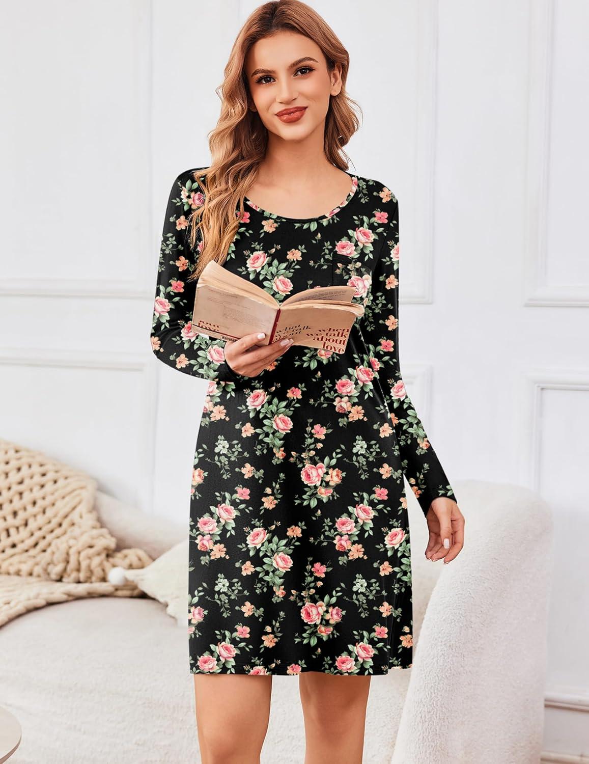 Ekouaer Women’s 2 Pack Sleepshirt Dress Comfortable Nightshirt Nightgown Long Sleeve Button Down Sleepwear(Blue White Floral white Purple Floral)