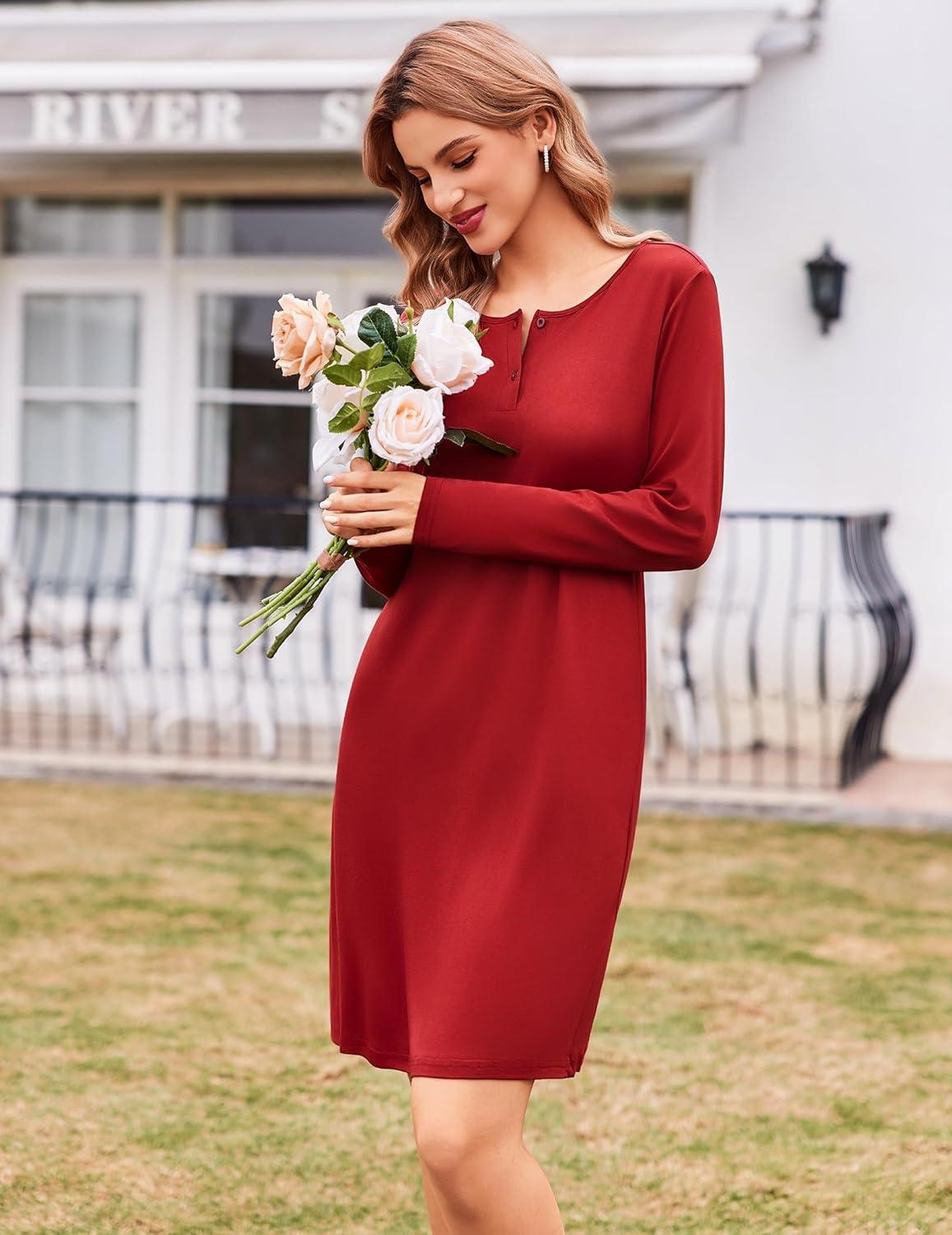 Ekouaer Women’s 2 Pack Sleepshirt Dress Comfortable Nightshirt Nightgown Long Sleeve Button Down Sleepwear(Navy Blue wine Red)