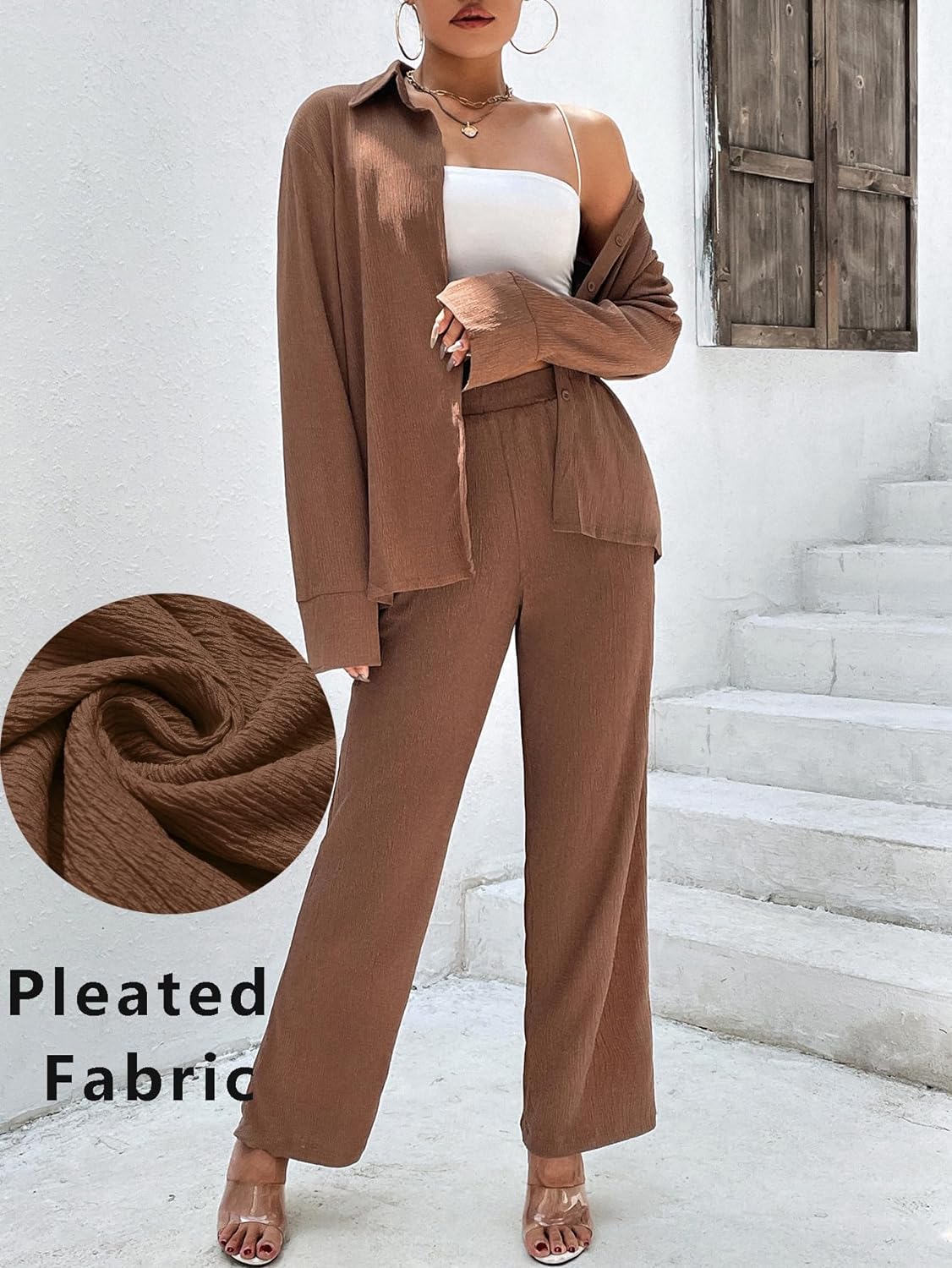 Ekouaer Womens 2 Piece Outfits Long Sleeve Button Down Shirt and Pants Matching Sets Loose Casual Loungewear with Pockets(Brown)