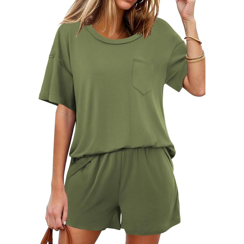 Ekouaer Women's 2 Piece Pajama Sets Short Sleeve Lounge Sets Soft Round Neck Top and Shorts Sleepwear(Army Green)